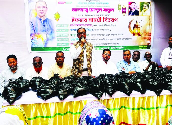 তিনি গতকাল মঙ্গলবার বিকেলে নগরের দেওয়ান বাজার ঘাটফরহাদ বেগ স্কুল মাঠে পবিত্র মাহে রমজান উপলক্ষে অসহায় দুস্থদের মাঝে ইফতার ও সেহেরি সামগ্রী বিতরণ অনুষ্ঠানে প্রধান অতিথির বক্তব্যে এসব কথা বলেন। এতে বিশেষ অতিথি ছিলেন চট্টগ্রাম–৯ আসনের সংসদ সদস্য আবু সুফিয়ান এবং নগর বিএনপির সাবেক সাধারণ সম্পাদক আবুল হাশেম বক্কর। চট্টগ্রাম মহানগর বিএনপির সাবেক যুগ্ম সম্পাদক আবদুল মান্নানের সার্বিক সহযোগিতায় এতে অসহায় ও নিম্নবিত্ত পরিবারের মাঝে চাল, ডাল, তেল, ছোলাসহ প্রয়োজনীয় ইফতার ও খাদ্যসামগ্রী বিতরণ করা হয়।