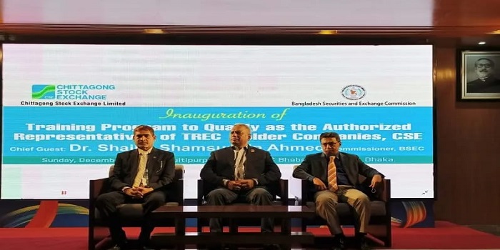 চিটাগং স্টক এঙচেঞ্জ (সিএসই)’র ট্রেক হোল্ডার কোম্পানীসমূহের অথরাইজড রিপ্রেজেনটেটিভদের কোয়ালিফাইড হওয়ার চার দিন ব্যাপী প্রশিক্ষণ বাংলাদেশ সিকিউরিটিজ এন্ড একচেঞ্জ কমিশন (বিএসইসি)’র মাল্টিপারপাস হলে গতকাল রোববার শুরু হয়েছে। প্রশিক্ষণ অনুষ্ঠানের উদ্বোধন করেন বিএসইসির কমিশনার ড. শেখ শামসুদ্দিন আহমেদ। এতে আরো উপস্থিত ছিলেন সিএসইর ব্যবস্থাপনা পরিচালক মো. গোলাম ফারুক, চিফ রেগুলেটরি অফিসার মো. মর্তুজা আলম, এজিএম এবং হেড অব ট্রেনিং আরিফ আহমেদ এবং ম্যানেজার আদনান আব্দুর রকিব।