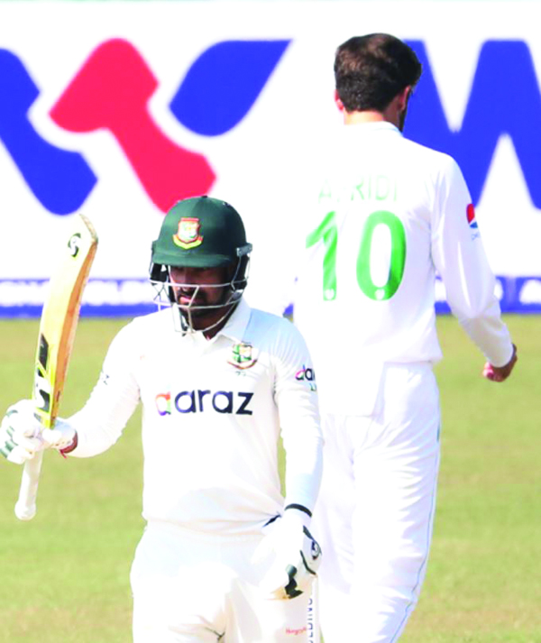এর আগে চতুর্থ দিন মাঠে নেমেই বিপাকে পড়ে বাংলাদেশ। তৃতীয় দিনের খেলা শেষে ৪ উইকেট হারিয়ে ৩৯ রান সংগ্রহ করেছিল টাইগাররা। তখন ক্রিজে ছিলেন মুশফিকুর রহিম এবং ইয়াসির আলী। খেলতে নেমে পাকিস্তান পেসার হাসান আলীর বলে বোল্ড হন মুশফিক। ৩৩ বলে ১৬ রান করেন তিনি। এরপর শাহিন শাহ আফ্রিদির বাউন্সার ব্যাট হাতে থিতু হয়ে থাকা ইয়াসির আলীর হেলমেটে আঘাত করে। পরে মাঠে ফিজিও আসার পর তার সঙ্গে কথা বলে খেলা চালিয়ে গেলেও, পানি পানের বিরতির সময় ফিজিওর সঙ্গে মাঠ ছাড়েন এই মিডলঅর্ডার ব্যাটার। ৭২ বলে ৬টি চারে ৩৬ রান করেন তিনি। ইয়াসির উঠে যাওয়ায় পর উইকেটে আসনে মেহেদী হাসান মিরাজ। সাজিদ খানের বলে এলবি হয়ে মাঠ ছাড়েন তিনি। ৪৪ বলে ১১ রান করেন মিরাজ। দ্বিতীয় ইনিংসে লাঞ্চ বিরতির পর টেস্ট ক্যারিয়ারের দশম হাফসেঞ্চুরি তুলে নেন লিটন দাস। প্রথম ইনিংসে তিনি দুর্দান্ত সেঞ্চুরি হাঁকিয়েছিলেন। তবে এরপরই ইয়াসির আলীর কনকাশন বদলি হিসেবে নামা নুরুল হাসান সোহান বিদায় নেন। ৩৩ বলে ১৫ রান করেন এই ডানহাতি। সোহানের পর বিদায় নেন লিটনও। আফ্রিদির বলে এলবি হয়ে ৮৯ বলে ৬টি চারে সর্বোচ্চ ৫৯ রান করে বিদায় নেন তিনি। এরপর তাইজুল ইসলাম ও আবু জায়েদের দ্রুত বিদায়ে বাংলাদেশের দ্বিতীয় ইনিংস ১৫৭ রানে থামে। ক্যারিয়ারে চতুর্থবার ৫ উইকেট পান পাকিস্তানের শাহীন আফ্রিদি। এছাড়া সাজিদ খান ৩টি ও হাসান আলী ২টি উইকেট লাভ করেন।