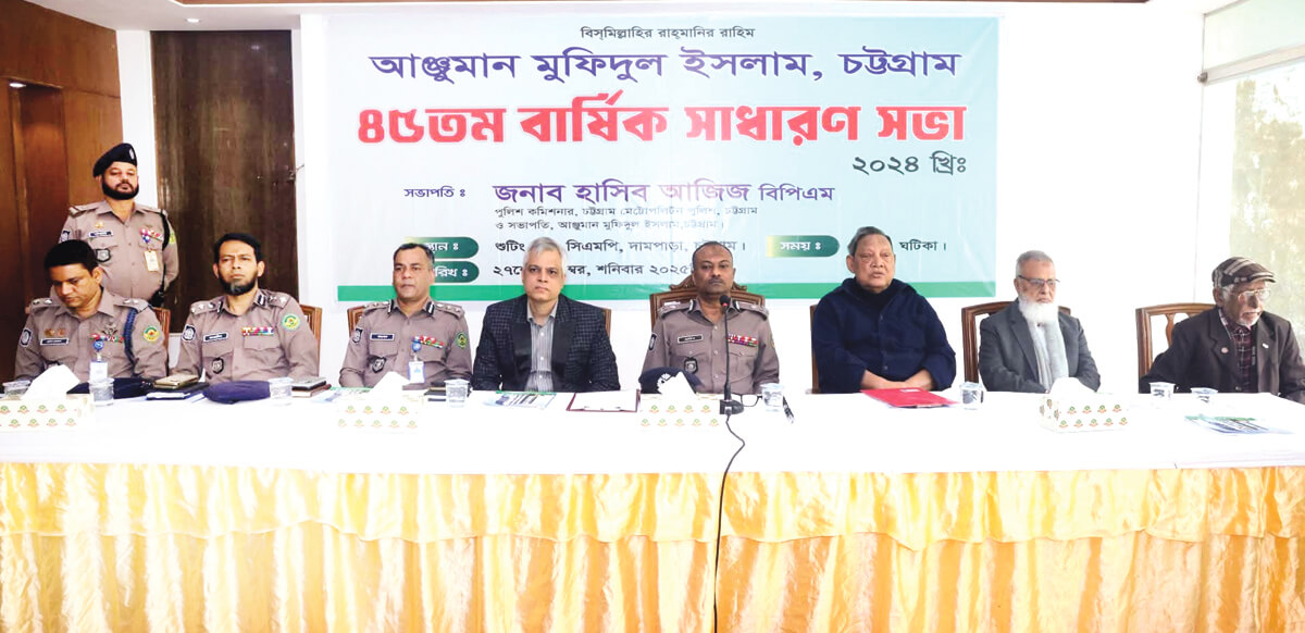 আঞ্জুমান মুফিদুল ইসলাম, চট্টগ্রামের সভাপতি ও সিএমপি কমিশনার হাসিব আজিজের সভাপতিত্বে গতকাল শনিবার দামপাড়াস্থ পুলিশ লাইন্স মেট্রোপলিটন শুটিং ক্লাব সম্মেলন কক্ষে সংস্থার ৪৫ তম বার্ষিক সাধারণ সভা অনুষ্ঠিত হয়। সভা পরিচালনা করেন সাধারণ সম্পাদক নজমুল হক চৌধুরী ও কোষাধ্যক্ষ মোরশেদুল আলম কাদেরী। শুরুতে পবিত্র কোরআন থেকে তেলাওয়াত ও মুনাজাত পরিচালনা করেন মাওলানা মো. তসলিম উদ্দিন। প্রয়াত সদস্য ও আঞ্জুমানের পক্ষ থেকে ত্রাণ দিতে গিয়ে শাহাদাৎ বরণকারী সাবেক সাধারণ সম্পাদক প্রকৌশলী মুনাওয়ার আহমদ, সাংগঠনিক সম্পাদক প্রকৌশলী হারুন সালাম, শাহেদুল আলম কাদেরী, শবাগার রক্ষক আজগর খান ও ড্রাইভার মো. জহিরুল ইসলামের রুহের মাগফেরাতের জন্য দোয়া করা হয়। এছাড়াও শুরু থেকে আজ পর্যন্ত আঞ্জুমানে অবদান রেখে যারা মৃত্যুবরণ করেছেন ও আঞ্জুমান কর্তৃক দাফন কৃত বেওয়ারিশ লাশের রুহের মাগফেরাত কামনা করে দোয়া করেন। স্বাগত বক্তব্য দেন সহ–সভাপতি মোহাম্মদ ইউসুফ সর্দার। বার্ষিক প্রতিবেদন ও বাজেট উপস্থাপন করেন সাধারণ সম্পাদক নজমুল হক চৌধুরী। বার্ষিক হিসাব বিবরণী উপস্থাপন করেন কোষাধ্যক্ষ মোরশেদুল আলম কাদেরী। সিএমপির পক্ষে উপস্থিত ছিলেন অতিরিক্ত পুলিশ কমিশনার (ট্রাফিক) ও সহ–সভাপতি ওয়াহিদুল হক চৌধুরী, উপ–পুলিশ কমিশনার (সদর) মুহাম্মদ ফয়সাল আহমেদ, উপ–পুলিশ কমিশনার (এস্টেট অ্যান্ড ডেভেলাপমেন্ট) ফেরদৌস আলী চেীধুরী, উপ–পুলিশ কমিশনার (ওয়েলফেয়ার অ্যান্ড র্ফোস) মো. হাসান মোস্তফা স্বপন।
