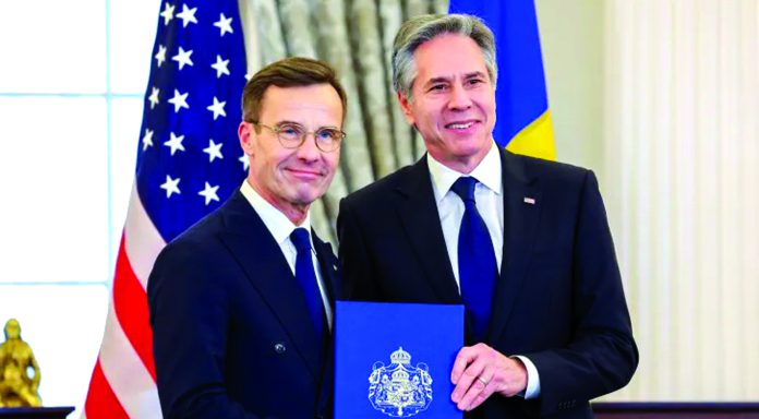 সামরিক জোট ন্যাটোতে আনুষ্ঠানিকভাবে যোগ দিল সুইডেন। ইউরোপে রাশিয়ার আগ্রাসন নিয়ে ক্রমবর্ধমান উদ্বেগের মধ্যেই দেশটির কয়েক দশকের নিরপেক্ষতার অবসান ঘটল। খবর আল জাজিরার। খবর বাংলানিউজের। মার্কিন পররাষ্ট্রমন্ত্রী অ্যান্টনি ব্লিঙ্কেনের সঙ্গে বৈঠকের পর ওয়াশিংটন ডিসিতে দেওয়া এক বিবৃতিতে সুইডেনের প্রধানমন্ত্রী উলফ ক্রিস্টারসন বলেন, ন্যাটো সদস্য হিসেবে ঐক্য ও সংহতি হবে সুইডেনের পথপ্রদর্শক। তিনি বলেন, আমরা মিত্রদের সঙ্গে বোঝা, দায়িত্ব ও ঝুঁকি ভাগ করে নেব। ব্লিঙ্কেন সুইডেনের ন্যাটোতে যোগদানের নথি পাওয়ার সময় বলেন, যারা অপেক্ষা করে, তাদের কাছে ভালো জিনিস আসে। এটি সুইডেনের জন্য, আমাদের জোটের জন্য এবং ট্রান্স–আটলান্টিক সম্পর্কের জন্য একটি ঐতিহাসিক মুহূর্ত। বৃহস্পতিবার স্টকহোমে এক সংবাদ সম্মেলনে সুইডেনের কর্মসংস্থানমন্ত্রী জোহান পেহরসন ন্যাটোতে যোগদানকে সুইডেনের জন্য একটি নতুন নিরাপত্তা নীতির যুগ বলে আখ্যা দেন। তিনি বলেন, ব্যক্তিগতভাবে ২০ বছর ধরে তিনি এমন সিদ্ধান্তের জন্য অপেক্ষা করছেন। ২০২২ সালের ২৪ ফেব্রুয়ারি রাশিয়া ইউক্রেনে যুদ্ধ শুরু করে। এ ঘটনায় সুইডেন ও প্রতিবেশী ফিনল্যান্ড ন্যাটোতে যোগদানের আবেদন করে। রাশিয়ার সঙ্গে দেশ দুটির এক হাজার ৩৪০ কিলোমিটার সীমান্ত রয়েছে।