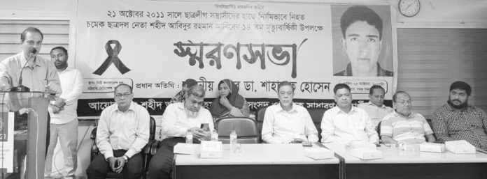 তিনি গতকাল শনিবার দুপুরে চট্টগ্রাম মেডিকেল কলেজের নিউ কনফারেন্স হলে চমেক ছাত্রদল নেতা শহীদ আবিদুর রহমানের ১৪তম মৃত্যুবার্ষিকী উপলক্ষে আবিদ স্মৃতি সংসদের উদ্যোগে আয়োজিত স্মরণসভায় প্রধান অতিথির বক্তব্যে এসব কথা বলেন। তিনি আবিদের স্মৃতির প্রতি সম্মান জানিয়ে চট্টগ্রামের গুরুত্বপূর্ণ স্থাপনা আবিদের নামে নামকরণের দাবি জানান। অনুষ্ঠানের শুরুতে শহীদ আবিদের রূহের মাগফেরাত কামনা করে দোয়া ও মোনাজাত করা হয়। দোয়া ও মোনাজাত পরিচালনা করেন এবিএম রাকিব। শহীদ আবিদ স্মৃতি সংসদের আহ্বায়ক ডা. মাহমুদুল হাসানের সভাপতিত্বে এবং চমেক ৫২তম ব্যাচের ডা. সাদ্দাম হোসেনের পরিচালনায় অনুষ্ঠানে বিশেষ অতিথি ছিলেন চমেক হাসপাতালের পরিচালক ব্রিগেডিয়ার জেনারেল ডা. মো. তসলিম উদ্দিন, চমেক উপাধ্যক্ষ ডা. মো. আব্দুর রব, ড্যাব চমেক শাখার সভাপতি অধ্যাপক ডা. জসিম উদ্দিন, ড্যাব চট্টগ্রাম জেলা শাখার সভাপতি অধ্যাপক ডা. তমিজ উদ্দিন আহমেদ মানিক, চট্টগ্রাম মহানগর শাখার সভাপতি অধ্যাপক ডা. আব্বাস উদ্দিন, ড্যাব চমেক শাখার সাধারণ সম্পাদক ডা. ফয়েজুর রহমান, ড্যাব চট্টগ্রাম জেলা শাখার সাধারণ সম্পাদক ডা. বেলায়েত হোসেন ঢালী ও ড্যাব মহানগর সাধারণ সম্পাদক ডা. ইফতেখারুল ইসলাম। বক্তব্য রাখেন চমেক ডেন্টাল ইউনিটের বিভাগীয় প্রধান ডা. মনোজ কুমার বড়ুয়া, এনডিএফ নেতা ডা. সাইফুল আজিম সাজ্জাদ, এনডিএফের কোষাধ্যক্ষ ডা. সাইয়েদুল মোস্তাকিম, শহীদ আবিদের বড় ভাই লুৎফর রহমান, জিল্লুর রহমান, মেঝ বোন মোর্শেদা আকতার, ড্যাব নেতা ডা. নুরুল করিম চৌধুরী, ডা. ঈসা চৌধুরী, ডা. শামীম আল মামুন, ডা. ইমরোজ উদ্দিন, ডা. রিফাত কামাল রনি, ডা. মোনাইম ফরহাদ, ডা. আসহাব মেহেরাজ আসিফ, ডা. সামিয়ুল করিম, ডা. মেহেদী হাসান, চমেক ৬৩ ব্যাচের ছাত্র সাইফুল ইসলাম ইমন প্রমুখ।