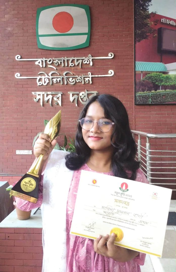 চট্টগ্রাম আবারও পেল নতুন গৌরব। ছোট্ট কণ্ঠে বড় স্বপ্ন বুকে নিয়ে এগিয়ে যাওয়া সাবিলা সুলতান বাণী জয় করেছে দেশের সবচেয়ে ঐতিহ্যবাহী শিশু–কিশোর প্রতিযোগিতা নতুন কুঁড়ি ২০২৫ এর আবৃত্তি বিভাগে জাতীয় চ্যাম্পিয়ন হওয়ার মুকুট। খ বিভাগে প্রথম স্থান অর্জনের মধ্য দিয়ে বাণী শুধু নিজের পরিবার নয়, পুরো চট্টগ্রামকেও আবার আলোচনার কেন্দ্রবিন্দুতে নিয়ে এসেছে। পূর্ব বাকলিয়ার ১৮ নম্বর ওয়ার্ডের ফজর আলী মুন্সির বাড়িতে বড় হওয়া বাণী বর্তমানে পূর্ব বাকলিয়া সিটি কর্পোরেশন বালিকা উচ্চ বিদ্যালয়ের ষষ্ঠ শ্রেণির শিক্ষার্থী। অল্প বয়সেই কণ্ঠে পরিণত আবৃত্তির সুর ও কথনভঙ্গি দিয়ে বিচারক ও দর্শকদের মুগ্ধ করেছে সে। জাতীয় মঞ্চে চ্যাম্পিয়ন হওয়ার সুবাদে বাণী পেয়েছে নতুন কুঁড়ির চ্যাম্পিয়ন ট্রফি, সার্টিফিকেট, দুই লাখ টাকার চেক এবং সবচেয়ে গুরুত্বপূর্ণ বাংলাদেশ টেলিভিশনের তালিকাভুক্ত শিল্পী হওয়ার স্বীকৃতি।