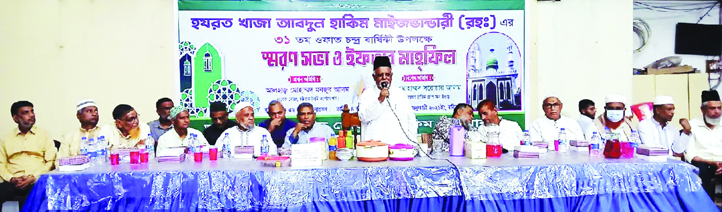চট্টগ্রাম সিটি কর্পোরেশনের সাবেক মেয়র আলহাজ্ব মোহাম্মদ মনজুর আলমের পিতা হযরত খাজা আব্দুল হাকিম মাইজভান্ডারীর ৩১ তম ওফাত চন্দ্রবার্ষিকী উপলক্ষে ২২ ফেব্রুয়ারি দিনব্যাপী কর্মসূচি পালিত হয়েছে। পারিবারিক আয়োজনে মোস্তফা হাকিম ভবন অডিটোরিয়ামে খতমে কুরআনে পাক, মিলাদ ও দোয়া মাহফিল, আলোচনা সভা ও ইফতার অনুষ্ঠিত হয়েছে। আলোচনা সভায় সভাপতিত্ব করেন সাবেক মেয়র মোহাম্মদ মঞ্জুর আলম। আলোচনা করেন বিএনপি চট্টগ্রাম মহানগরের যুগ্য আহ্বায়ক মঞ্জুরুল আলম মঞ্জু, মোস্তফা হাকিম গ্রুপের পরিচালক, সমাজসেবক ও শিক্ষানুরাগী মোঃ সরওয়ার আলম, ১০নং ওয়ার্ড বিএনপি‘র আহবায়ক রফিক উদ্দিন চৌধুরী, সদস্য সচিব সেলিম উদ্দিন, সাবেক সাধারণ সম্পাদক শামসুল আলম, আববাস রশিদ, কুতুব উদ্দিন, আইয়ুব খান, মাইনুদ্দিন চৌধুরী, মোহাম্মদ শফি, নাসির উদ্দিন প্রমুখ। আলোচনা সভায় মোস্তফা হাকিম গ্রুপের পরিচালক আলহাজ্ব মোঃ নিজামুল আলম, আলহাজ্ব মোহাম্মদ ফারুক আজম, আলহাজ্ব মোঃ সাইফুল আলম, আলহাজ্ব মোঃ শাহিদুল আলম, বিএনপি, যুবদল, শ্রমিক দল, মহিলা দল, ছাত্রদলের বিভিন্ন স্তরের নেতৃবৃন্দ উপস্থিত ছিলেন। সভাপতির আলোচনায় সাবেক মেয়র মোহাম্মদ মনজুর আলম বলেন, আমার পিতা আব্দুল হাকিম মাইজভান্ডারী সব সময় আখেরাতের চিন্তায় কর্মজীবন পরিচালনা করেছেন। তিনি অলি আউলিয়াদের প্রতি ভক্তি ও শ্রদ্ধা পোষণ করে জীবন অতিবাহিত করেছেন। তার কাছে দাম্ভিকতা, অহমিকা ও লোভ লালসা কিছুই ছিল না। তিনি ছিলেন একজন খাঁটি ধার্মিক মাটির মানুষ। আমরা তার পদাঙ্ক অনুসরণ করে জীবন জীবিকা পরিচালনা করছি। তিনি বলেন, তার পিতার আদর্শ ধারণ করে সমাজসেবা করে যাচ্ছি। আলোচনা সভার পর হাজারের বেশি রোজাদারদের ইফতার করানো হয়। মোনাজাত পরিচালনা করেন তৈয়বিয়া জামে মসজিদের খতিব হযরত মাওলানা শাহ ইমরান রজভী। প্রেস বিজ্ঞপ্তি।