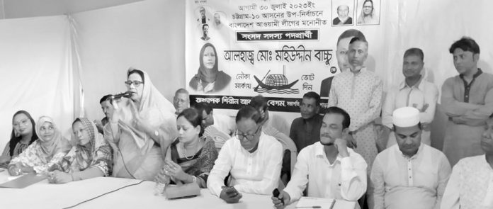 চট্টগ্রাম–১০ আসনের উপ–নির্বাচনে আওয়ামী লীগ মনোনীত প্রার্থী মো. মহিউদ্দিন বাচ্চুকে বিজয়ী করতে নারী সমাজের প্রতি আহ্বান জানিয়ে চট্টগ্রাম মহানগর মহিলা আওয়ামী লীগের সভাপতি হাসিনা মহিউদ্দিন বলেন, নারীরা সমাজের অর্ধেক অংশ। তারা সমাজ উন্নয়নেও পুরুষের পাশাপাশি সমান অংশীদার। এই এলাকার আর্থ–সামাজিক উন্নয়নে মহিলাদের সম্পৃক্ততা বাড়ানোর জন্য নৌকার প্রার্থীর বিজয়ের কোনো বিকল্প নেই।