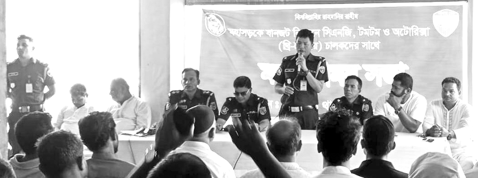 মহাসড়কে যানজট নিরসনে সিএনজি, টমটম, অটোরিক্সা, থ্রি হুইলার চালকদের সঙ্গে মতবিনিময় সভা করেছে থানা, ট্রাফিক ও হাইওয়ে পুলিশ। ১৫ মার্চ (জুমাবার) বিকেলে ঈদগাঁও বাস–স্টেশনস্থ জাপান মার্কেটে এ মতবিনিময় সভা অনুষ্ঠিত হয়। ঈদগাঁও থানার ভারপ্রাপ্ত কর্মকর্তা (ওসি) শুভ রঞ্জন চাকমার সভাপতিত্বে আমন্ত্রিত অতিথি হিসেবে বক্তব্য রাখেন রামু তুলা বাগান হাইওয়ে থানার ভারপ্রাপ্ত কর্মকর্তা আজিজুল বারী, ঈদগাঁও ট্রাফিক পুলিশের ইনচার্জ প্রিয়দর্শী চাকমা, ডুলহাজারা হাইওয়ে পুলিশ ফাঁড়ির ইনচার্জ মোঃ মোজাম্মেল হক। অন্যান্যদের মধ্যে বক্তব্য রাখেন, ইসলামাবাদ ইউনিয়নের সাবেক চেয়ারম্যান নুরুল হক, শ্রমিক নেতা ও উপজেলা চেয়ারম্যান পদপ্রার্থী সেলিম আকবর, যানবাহন শ্রমিক নেতা আবু তাহের মুন্না,নুরুল আজিম, স্থানীয় এমইউপি আবু বক্কর ছিদ্দিক বান্ডি, আলাদীনের চেরাগের স্বত্বাধিকারী ব্যবসায়ী ফরিদুল আলম প্রমুখ। ঈদগাঁও থানার ভারপ্রাপ্ত কর্মকর্তা (ওসি) শুভ রঞ্জন চাকমা বলেন, চলমান পবিত্র রমজান মাস ও আসন্ন পবিত্র ইদুল ফিতর উপলক্ষে মহাসড়কে দুর্ঘটনা, যানজট নিরসন, ভোগান্তি, কক্সবাজারের আগত পর্যটকদের যাত্রা নিরাপদ করতে থানা পুলিশের পাশাপাশি ট্রাফিক পুলিশ, হাইওয়ে পুলিশ সবসময় বদ্ধপরিকর। বিশেষ করে পর্যটকদের যাত্রা নিরাপদ করতে যানবাহন চালকদের সঙ্গে মতবিনিময় সভা করে জনসচেতনতা সৃষ্টি করা হয়েছে। প্রেস বিজ্ঞপ্তি।