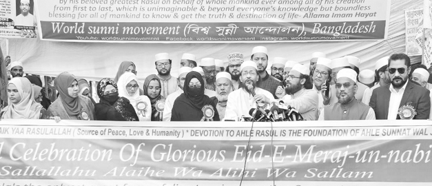 ঈদে মেরাজ শরীফের মহান তাৎপর্য্য তুলে ধরার লক্ষ্যে বিশ্ব সুন্নী আন্দোলনের উদ্যোগে গতকাল ঢাকা প্রেসক্লাব সম্মুখে সমাবেশ ও সমাবেশ শেষে বর্ণাঢ্য শোভাযাত্রা অনুষ্ঠিত হয়। এ উপলক্ষে আয়োজিত সমাবেশে সভাপতির বক্তব্যে বিশ্ব সুন্নি আন্দোলন ও বিশ্ব ইনসানিয়াত বিপ্লবের প্রতিষ্ঠাতা আল্লামা ইমাম হায়াত বলেন, দয়াময় আল্লাহতাআলার সাথে আমাদের প্রাণাধিক প্রিয়নবী সাল্লাল্লাহু আলাইহি ওয়া আলিহী ওয়া সাল্লামের মোবারক প্রত্যক্ষ সাক্ষাত মহান মেরাজ শরীফ সমগ্র মানবমন্ডলীর জন্য আল্লাহতাআলার সংযোগ ও বন্ধন এবং অসীম করুনার উৎস। আল্লামা ইমাম হায়াত বলেন, মহান মেরাজ শরীফ প্রিয়নবীর নিকট স্বয়ং আল্লাহতাআলার মহিমাময় প্রত্যক্ষ প্রকাশ এবং প্রিয়নবীর মাধ্যমে সমগ্র সৃষ্টির নিকট রহমতময় পরোক্ষ প্রকাশ। তিনি বলেন, আল্লাহতাআলা তাঁর অসীম ক্ষমতায় মহান প্রিয়নবীকে স্থান কালের উর্ধ্বে তাঁর পরম নৈকট্যে পৌঁছিয়ে তাঁর পবিত্র মহাসত্তার নূর ও তাজাল্লিতে মিলিত করে সমগ্র মানবমন্ডলীর জন্য সত্যের আলো, জীবনের কেন্দ্র এবং সর্বজ্ঞান, সর্বগুণ ও সর্বকল্যাণের উৎসরূপে প্রকাশ করেছেন। আল্লামা ইমাম হায়াত বলেন, জীবনের দয়াময় স্রষ্টার গুণ–জ্ঞান–আলো রেসালাতের রহমতের ধারায় আলোকিত জীবন ও সকল মানুষের জন্য নিরাপত্তা–অধিকার–স্বাধীনতা–মর্যাদা–ভিত্তিক সর্বকল্যাণময় সর্বজনীন মানবতার রাষ্ট্র ও অখন্ড মানবতার মুক্ত দুনিয়া খেলাফতে গড়ে তোলার দিকদর্শন মহান মেরাজ শরীফ। সমাবেশে ঈদে মেরাজ শরীফ উপলক্ষে রাষ্ট্রীয় ছুটির দাবি জানান আল্লামা ইমাম হায়াত। প্রেস বিজ্ঞপ্তি।