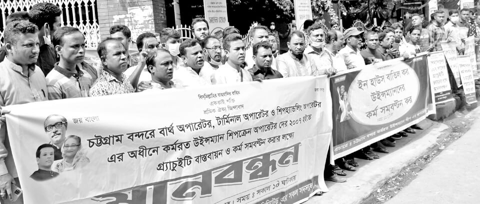 চট্টগ্রাম বন্দর বার্থ অপারেটর টার্মিনাল অপারেটর অ্যান্ড শিপ হ্যান্ডলিং অপারেটরদের অধীনে কর্মরত উইন্সম্যান শিপ ক্রেন অপারেটর শ্রমিকদের কর্ম সমবণ্টন ও গ্র্যাচুইটি বাস্তবায়নের দাবিতে মানববন্ধন অনুষ্ঠিত হয়েছে। চট্টগ্রাম বন্দর উইন্সম্যান শিপ ক্রেন অপারেটর কল্যাণ বহুমুখী সমিতি গতকাল বুধবার সকালে চট্টগ্রাম প্রেসক্লাবের সামনে মানববন্ধনের এই কর্মসূচি পালন করে।