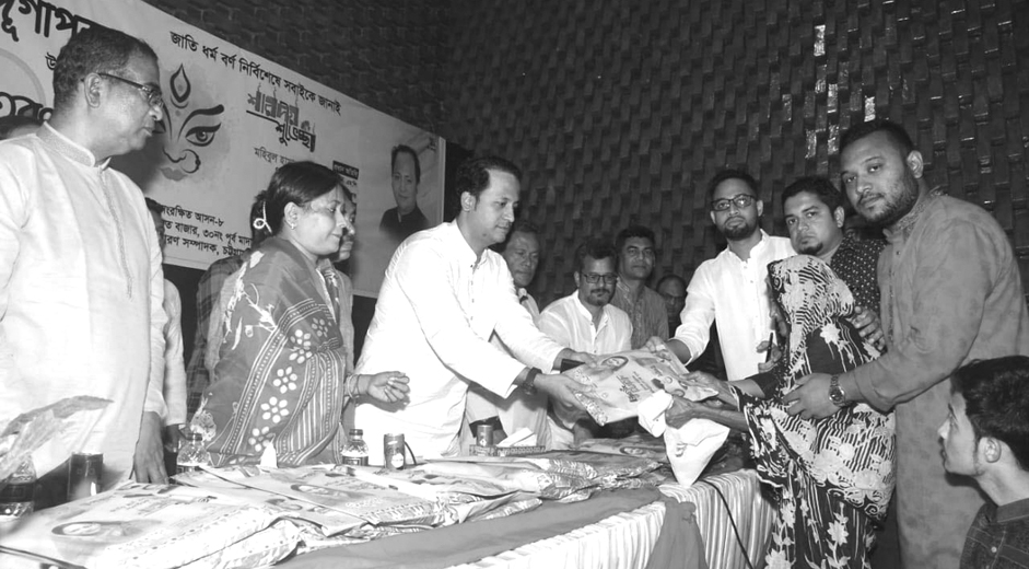 গতকাল শুক্রবার বিকেলে সদরঘাটস্থ ৭১ ক্লাবে শারদীয় দুর্গাপূজা উপলক্ষে ২২, ৩০ ও ৩১ নং ওয়ার্ডে বস্ত্র বিতরণ ও বিভিন্ন মণ্ডপে নগদ অর্থ বিতরণ অনুষ্ঠানে তিনি এসব কথা বলেন। প্রধান বক্তা ছিলেন, মহানগর যুবলীগের সভাপতি মাহাবুবুল হক সুমন। সভাপতিত্ব করেন কাউন্সিলর নিলু নাগ। বিশেষ অতিথি ছিলেন, কাউন্সিলর আবদুস সালাম মাসুম, কাউন্সিলর আতাউললা চৌধুরী, আলকরণ ওয়ার্ড আ’লীগ সভাপতি রুহুল আমিন তপন, সাধারণ সম্পাদক মো. ইব্রাহিম, ৩০ নং ওর্য়াড আ’লীগের সাধারণ সম্পাদক মুজিবুল ইসলাম পেয়ারু, ঐক্য পরিষদে মহানগরের সাধারণ সম্পাদক নিতাই প্রসাদ ঘোষ, যুগ্ম সাধারণ সম্পাদক বিশ্বজিৎ পালিত। মো. ইউনুসের পরিচালনায় বক্তব্য দেন, এনামুল হক মিলন, সিটি কলেজ ছাত্রলীগ সভাপতি আলী মিন্টু, ইসলামিয়া কলেজ ছাত্রলীগ সভাপতি রাকিবুল ইসলাম রাকিবসহ বিভিন্ন ওর্য়াডের পূজা মণ্ডপের নেতৃবৃন্দ। অনুষ্ঠানে প্রায় দুই হাজার নারীপুরুষের মাঝে বস্ত্র বিতরণ করা হয়। প্রেস বিজ্ঞপ্তি।