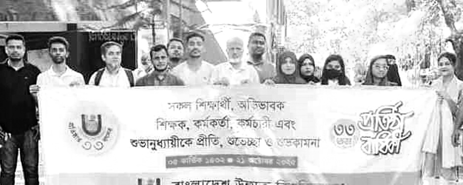 বাংলাদেশ উন্মুক্ত বিশ্ববিদ্যালয়ের ৩৩তম প্রতিষ্ঠাবার্ষিকী উপলক্ষে গতকাল মঙ্গলবার সারাদেশের বাউবি প্রধান কার্যালয়, আঞ্চলিক কেন্দ্র, উপ আঞ্চলিক কেন্দ্রে এক যোগে প্রতিষ্ঠাবার্ষিকী উদযাপিত হয়। চট্টগ্রাম আঞ্চলিক পরিচালক মো. ফরিদুল আলমের পরিচালনায় কেন্দ্রে জাতীয় পতাকা ও উন্মুক্ত বিশ্ববিদ্যালয়ের পতাকা উত্তোলন, আনন্দ র্যালি ও আলোচনা সভা অনুষ্ঠিত হয়। এতে উপস্থিত ছিলেন চট্টগ্রাম আঞ্চলিক কেন্দ্রের যুগ্ম পরিচালক হেলাল উদ্দিন পাটোয়ারী, বাউবি শিক্ষার্থী কল্যাণ সংগঠন ‘ডাক দিয়ে যাই’ এর কেন্দ্রীয় যুগ্ম সাধারণ সম্পাদক কাজী জাকির হোসেন, বৃহত্তর চট্টগ্রাম অঞ্চলের সভাপতি ফরহাদ হোসেন, সাধারণ সম্পাদক পারভেজ খান, সহ সাধারণ সম্পাদক বোরহান উদ্দিন, সাংগঠনিক সম্পাদক আশারাফুল ইসলাম সাকিল, অর্থ সম্পাদক সাদিয়া চৌধুরী, বিএ/বিএসএস প্রোগ্রাম বিষয়ক সম্পাদক মেহরাজ, সহ অর্থ সম্পাদক নয়ন সরকার প্রমুখ।