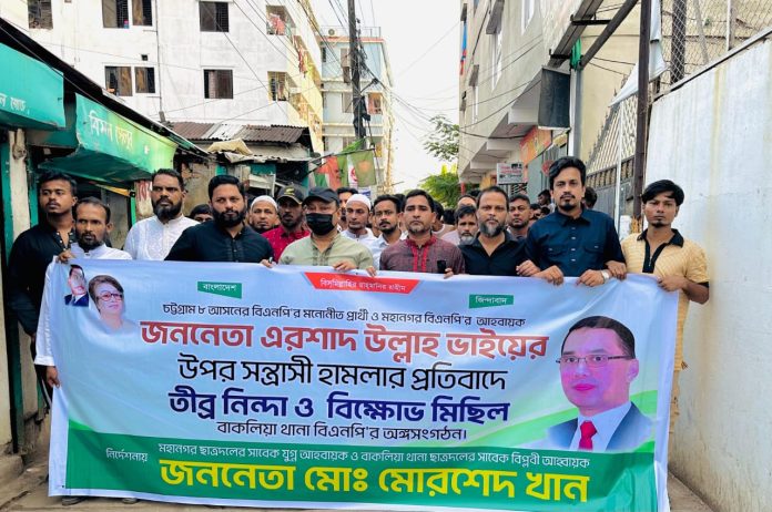 চট্টগ্রাম মহানগর বিএনপির আহ্বায়ক ও চট্টগ্রাম-৮ আসনের ধানের শীষের মনোনীত প্রার্থী এরশাদ উল্লাহ’র ওপর সন্ত্রাসী হামলার প্রতিবাদে দক্ষিণ বাকলিয়ায় বিক্ষোভ ও প্রতিবাদ মিছিল অনুষ্ঠিত হয়েছে।