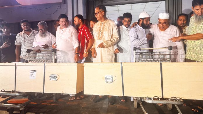 রাত ৯টা ৫ মিনিট। একে একে বিমানবন্দরের কার্গো গেইট দিয়ে বের হয়ে আসে ৮টি লাশবাহী কফিন। আত্মীয়স্বজনসহ শোকাহত সন্দ্বীপবাসী মুহূর্তে শোককে শক্তিতে পরিণত করে কফিনগুলো বুঝে নিচ্ছে। দলমত নির্বিশেষে সবাইকে দেখা যায় কফিনগুলো কাঁধে তুলে নিতে। পরম যত্নে উঠিয়ে দেয় লাশবাহী অ্যাম্বুল্যান্সে। রাত ১০টা ৪০ মিনিট। বিমানবন্দরের আনুষ্ঠানিকতা শেষ করে লাশবাহী সাতটি অ্যাম্বুল্যান্স একসাথে সাইরেন বাজিয়ে কুমিরা ঘাটের উদ্দেশে যাত্রা শুরু করে।