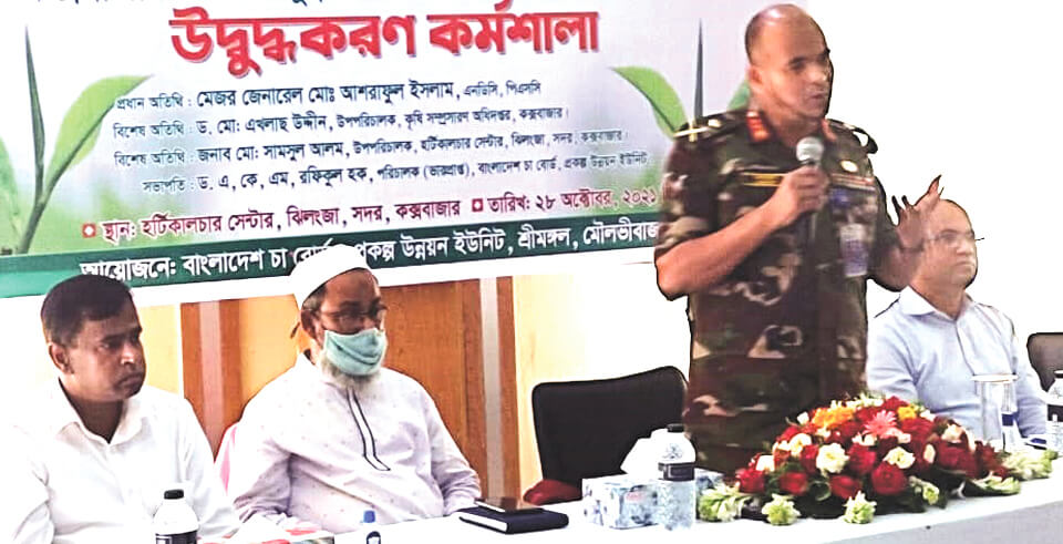 কক্সবাজার জেলায় আগ্রহী ব্যক্তিদের চা চাষে আরও উদ্বুদ্ধ করতে কক্সবাজার সদরের ঝিলংজা হর্টিকালচার সেন্টারে বাংলাদেশ চা বোর্ডেল প্রকল্প উন্নয়ন ইউনিট-এর ভারপ্রাপ্ত পরিচালক ড. এ কে এম রফিকুল হকের সভাপতিত্বে দিনব্যাপী কর্মশালা অনুষ্ঠিত হয়। এতে প্রধান অতিথি ছিলেন চা বোর্ডের চেয়ারম্যান মেজর জেনারেল মো. আশরাফুল ইসলাম, বিশেষ অতিথি ছিলেন কৃষি সম্প্রসারণ অধিদপ্তরের উপপরিচালক ড. মো. এখলাস উদ্দীন, ঝিলংজা হর্টিকালচার সেন্টারের উপপরিচালক মো. সামসুল আলম। কর্মশালায় উপস্থিত ছিলেন কক্সবাজার সদর, রামু ও চকরিয়া উপজেলা হতে আগত প্রায় ৬০ জন চা চাষে আগ্রহী ব্যক্তিবর্গ। অনুষ্ঠানে বক্তারা কক্সবাজারে চা চাষের অপার সম্ভাবণা রয়েছে বলে উল্লেখ করেন। চা বোর্ডের চেয়ারম্যান মেজর জেনারেল মো. আশরাফুল ইসলাম বলেন, বাংলাদেশে বর্তমানে ১৬৭টি চা বাগান রয়েছে। যার মোট আয়তন ২৭৯৪৩৯.৬৩ একর, এর মধ্যে চা চাষাধীন জমি রয়েছে ১৫৪৫১৫.৭৯ একর। তাছাড়া ক্ষুদ্রায়ন চা চাষাধীন জমির পরিমাণ প্রায় ৮০৫৭ একর। দেশের জনসংখ্যা বৃদ্ধি, অর্থনৈতিক উন্নয়ন ও ভোক্তার রুচির পরিবর্তনের ফলে চায়ের অভ্যন্তরীণ চাহিদা দিন দিন বৃদ্ধি পাচ্ছে। আমাদের চিরাচরিত বৃহত্তর সিলেট ও চট্টগ্রাম অঞ্চলের চা বাগানগুলোতে যে চায়ের আবাদ ও আবাদযোগ্য ভূমি রয়েছে তার সর্বোচ্চ ব্যবহার করা হলেও আগামী দু’তিন দশকের মধ্যে দেশের আভ্যন্তরীণ চায়ের চাহিদা মেটানো সম্ভব হবে না। অথচ আমাদের লক্ষ্য দেশের আভ্যন্তরীণ চাহিদা মিটিয়ে ঐতিহ্যবাহী রপ্তানীমুখী চা শিল্পের উৎপাদনের কিয়দংশ বিদেশে রপ্তানী করে মূল্যবান বৈদেশিক মুদ্রা অর্জন করা। তাই আমাদের আশু প্রয়োজন জমির উৎপাদনশীলতা বৃদ্ধির সাথে সাথে চা আবাদী এলাকা সমপ্রসারণ করা। সে লক্ষ্যে উত্তরবঙ্গের সমভূমি এলাকায় সরকার চা চাষের উদ্যোগ গ্রহণ করে, যেখানে ইতিমধ্যে চা চাষীগণ ব্যাপক সাফল্য পেয়েছেন। অনুরূপভাবে দেশের দক্ষিণ-পূর্ব অঞ্চল বিশেষ করে কক্সবাজার ও বান্দরবান চা চাষের অপার সম্ভাবণা অনুমেয়। প্রেস বিজ্ঞপ্তি।