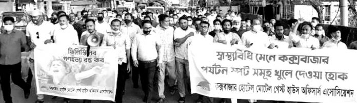করোনার দ্বিতীয় ঢেউ মোকাবেলার অংশ হিসাবে গত এপ্রিল মাস থেকে বন্ধ হোটেল-মোটেলসহ পর্যটনকেন্দ্রগুলো খুলে দেওয়ার দাবিতে এক মানববন্ধন ও বিক্ষোভ সমাবেশ গতকাল কক্সবাজারে অনুষ্ঠিত হয়েছে। বৃহস্পতিবার কঙবাজার হোটেল-মোটেল গেস্ট হাউস অফিসার্স এসোসিয়েশন এ সমাবেশের আয়োজন করে। সমাবেশের আগে একটি বিক্ষোভ মিছিল হোটেল মোটেল জোনের প্রধান সড়ক প্রদক্ষিণ করে। সমাবেশে বলা হয়, টানা লকডাউনের কারণে পর্যটন সংশ্লিষ্ট ব্যবসায়ীদের এখন করুন দশা। বেতন-ভাতা না পেয়ে অনেক কর্মকর্তা-কর্মচারী মানবেতর জীবনযাপন করছে। তাই স্বাস্থ্যবিধি মেনে, শর্ত সাপেক্ষে হলেও হোটেল মোটেলসমূহ খুলে দিলে পর্যটন শিল্প বাঁচানো যাবে। অন্যথায় সমুদ্র সৈকত ঘিরে গড়ে ওঠা কক্সবাজারের পর্যটন শিল্পের সাথে সংশ্লিষ্ট অর্ধলক্ষাধিক মানুষের পরিবারের দূর্ভোগ দিন দিন ঘনীভূত হবে। কঙবাজার হোটেল-মোটেল গেস্ট হাউস অফিসার্স এসোসিয়েশনের সভাপতি সুবীর চৌধুরী বাদলের সভাপতিত্বে ও সংগঠনের সদস্য আবদুর রহমানের সঞ্চালনায় অনুষ্ঠিত সমাবেশে আরো বক্তব্য দেন- উপদেষ্টা এডভোকেট মাহবুবুল আলম টিপু, আনোয়ার কামাল, সাধারণ সম্পাদক করিম উল্লাহ কলিম, সদস্য আওয়াদ হোসেন কেনেডি, এডভোকেট ইছহাক প্রমুখ।