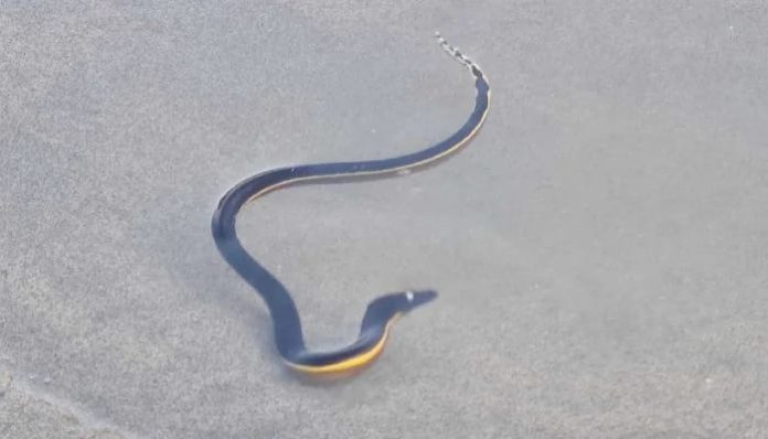 পুরোটা দেখে মনে হতেই পারে রঙিলা কোনো বিশেষ বস্তু। আদতে এটি বিষাক্ত ‘ইয়েলো বেলিড’ সাপ। যাদের বাস প্রশান্ত মহাসগরের পানির ওপরের স্তরে। সচারচর উপকূলে দেখা মেলে না।