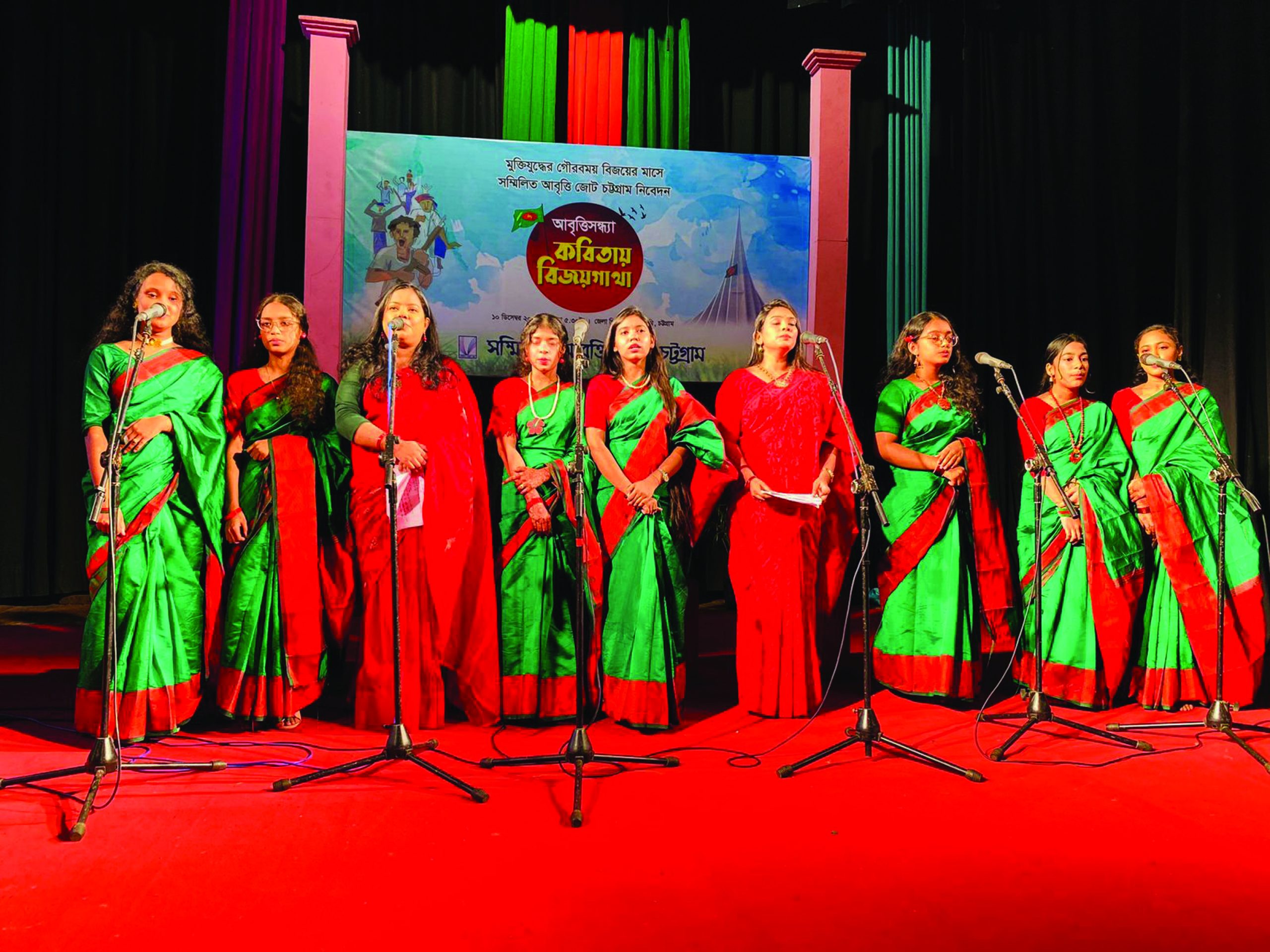 জেলা শিল্পকলা একাডেমিতে গতকাল বুধবার অনুষ্ঠিত হলো ‘কবিতায় বিজয়গাথা’ শিরোনামের নান্দনিক আবৃত্তি অনুষ্ঠান। মহান মুক্তিযুদ্ধের গৌরবময় বিজয় স্মরণে আবৃত্তি অনুষ্ঠানের আয়োজন করে মোর্চা সম্মিলিত আবৃত্তি জোট চট্টগ্রাম। জোটের সহ সভাপতি প্রণব চৌধুরীর সঞ্চালনায় অনুষ্ঠান শুরু হয় জোটের সভাপতি ফারুক তাহেরের স্বাগত বক্তব্যের মধ্য দিয়ে। অনুষ্ঠানে বিজয়ের নানা কবিতার দ্বৈত, ত্রয়ী ও বৃন্দ আবৃত্তিতে অংশগ্রহণ করে জোটভুক্ত সংগঠন বোধন আবৃত্তি পরিষদ, শৈশব বাচিক চর্চা কেন্দ্র, উচ্চারক আবৃত্তি কুঞ্জ, মুক্তধ্বনি আবৃত্তি সংসদ, চট্টগ্রাম বিশ্ববিদ্যালয় আবৃত্তি মঞ্চ, উদীরণ আবৃত্তি নীড়, অঙ্গন চট্টগ্রাম বিশ্ববিদ্যালয়, একুশ মানবিকতা ও আবৃত্তি চর্চা কেন্দ্র, তারুণ্যের উচ্ছ্বাস, স্বদেশ আবৃত্তি সংগঠন, দৃষ্টি চট্টগ্রাম, চট্টলা আবৃত্তি একাডেমি, স্বপ্নযাত্রী, পান্ডুলিপি আবৃত্তি দল, চট্টগ্রাম আবৃত্তি পরিষদ, স্পৃহা আবৃত্তি নীড়, বৈখরী আবৃত্তি আলয়, চট্টগ্রাম আবৃত্তি একাডেমি, প্রহর সাংস্কৃতিক অঙ্গন, ডিঙ্গি সাংস্কৃতিক সংগঠন, প্রমিতি সাংস্কৃতিক একাডেমি এবং প্রত্যয় শিক্ষা ও সাংস্কৃতিক একাডেমি। প্রেস বিজ্ঞপ্তি।