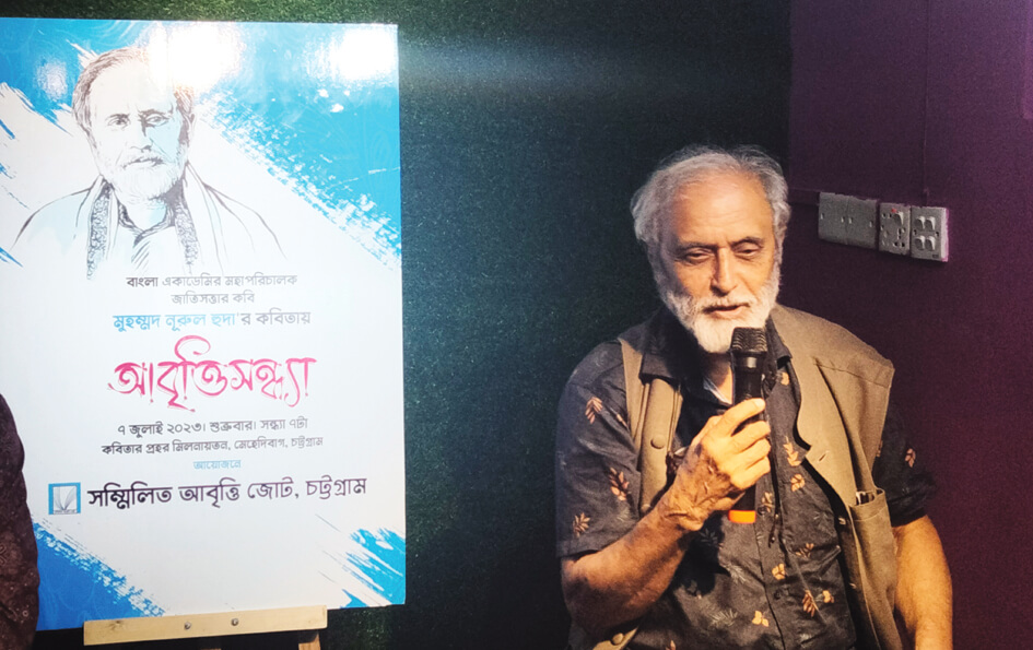 সম্মিলিত আবৃত্তি জোট চট্টগ্রামের আয়োজনে মেহেদীবাগস্থ কবিতার প্রহর মিলনায়তনে অনুষ্ঠিত আয়োজনে উপস্থিত ছিলেন কবি মুহম্মদ নূরুল হুদা। সম্মিলিত আবৃত্তি জোট সাধারণ সম্পাদক মুজাহিদুল ইসলামের সঞ্চালনায় এতে স্বাগত বক্তব্য রাখেন জোটের সভাপতি ফারুক তাহের। আলোচনায় অংশ নেন কবি আবু তাহের মোহাম্মদ, কবি ওমর কায়সার, আব্দুল হালিম দোভাষ, অধ্যাপক রুহু রুহেল, নিশাত হাসিনা শিরিন, মাসুদ বকুল, আলী প্রয়াস, আহমেদ মিরাজ প্রমুখ। অনুষ্ঠানে নুরুল হুদার কবিতা আবৃত্তি করেন সম্মিলিত আবৃত্তি জোটভুক্ত ২২টি সংগঠনের শিল্পীরা। আবৃত্তি করেন প্রণব চৌধুরী, মছরুর হোসেন, মোহাম্মদ সেলিম ভূইয়া, সঞ্জয় কুমার, স্নিদ্ধা বড়ুয়া, উম্মে সালমা নিঝুম, আব্দুল্লাহ ফারুক রবি, পায়েল বিশ্বাস, বর্ষা চৌধুরী, সুপ্রিয়া চৌধুরী, এএসএম এরফান, স্নিদ্ধা শিকদার, ফাইরুজ নাওয়াল দূর্দানা, প্রজ্ঞা পারমিতা প্রমুখ।