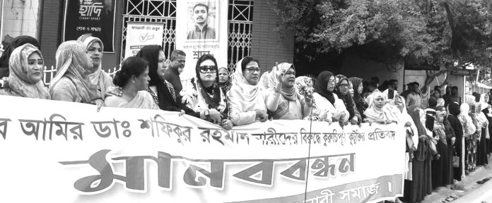 জামায়াতে ইসলামীর আমির ডা. শফিকুর রহমানের এক্স অ্যাকাউন্টে একটি পোস্টে নারীদের নিয়ে আপত্তিকর মন্তব্যের প্রতিবাদে মানববন্ধন ও বিক্ষোভ মিছিল করেছে চট্টগ্রামের সর্বস্তরের নারী সমাজ। মিছিল থেকে জামায়াত আমিরকে ক্ষমা চাওয়ার আহ্বান জানানো হয়েছে। গতকাল সোমবার চট্টগ্রাম প্রেসক্লাবের সামনে এ মানববন্ধন ও মিছিল করা হয়। প্রেসক্লাবের সামনে থেকে মিছিল শুরু হয়ে জামাল খান মোড় প্রদক্ষিণ করে চেরাগি মোড়ের সামনে শেষ হয়। মানববন্ধনে বক্তারা কর্মজীবী নারীদের নিয়ে করা মন্তব্যকে ‘আপত্তিকর’ ও ‘নারীর মর্যাদাহানিকর’ বলে উল্লেখ করেন। তারা বলেন, কর্মজীবী নারীদের অবমাননাকর বক্তব্য কোনোভাবেই গ্রহণযোগ্য নয়।