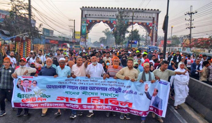 গতকাল সোমবার বিকালে মিছিলটি কাট্টলী এলাকা থেকে শুরু হয়ে সিটি গেইট হয়ে কর্নেল হাট বাজারে গিয়ে শেষ হয়। সেখানে সংক্ষিপ্ত সমাবেশে মনজুর আলম বলেন, একাত্তরকে ধারণ করে বাংলাদেশের সমস্ত মানুষ ধানের শীষের পক্ষে একতাবদ্ধ হয়েছেন। ধানের শীষের বিজয় সুনিশ্চিত। এই বিজয় কোন ষড়যন্ত্রাকারী দল রুখতে পারবে না। বাংলাদেশের মানুষ মুক্তিযুদ্ধের পক্ষে একতাবদ্ধ হয়েছে।