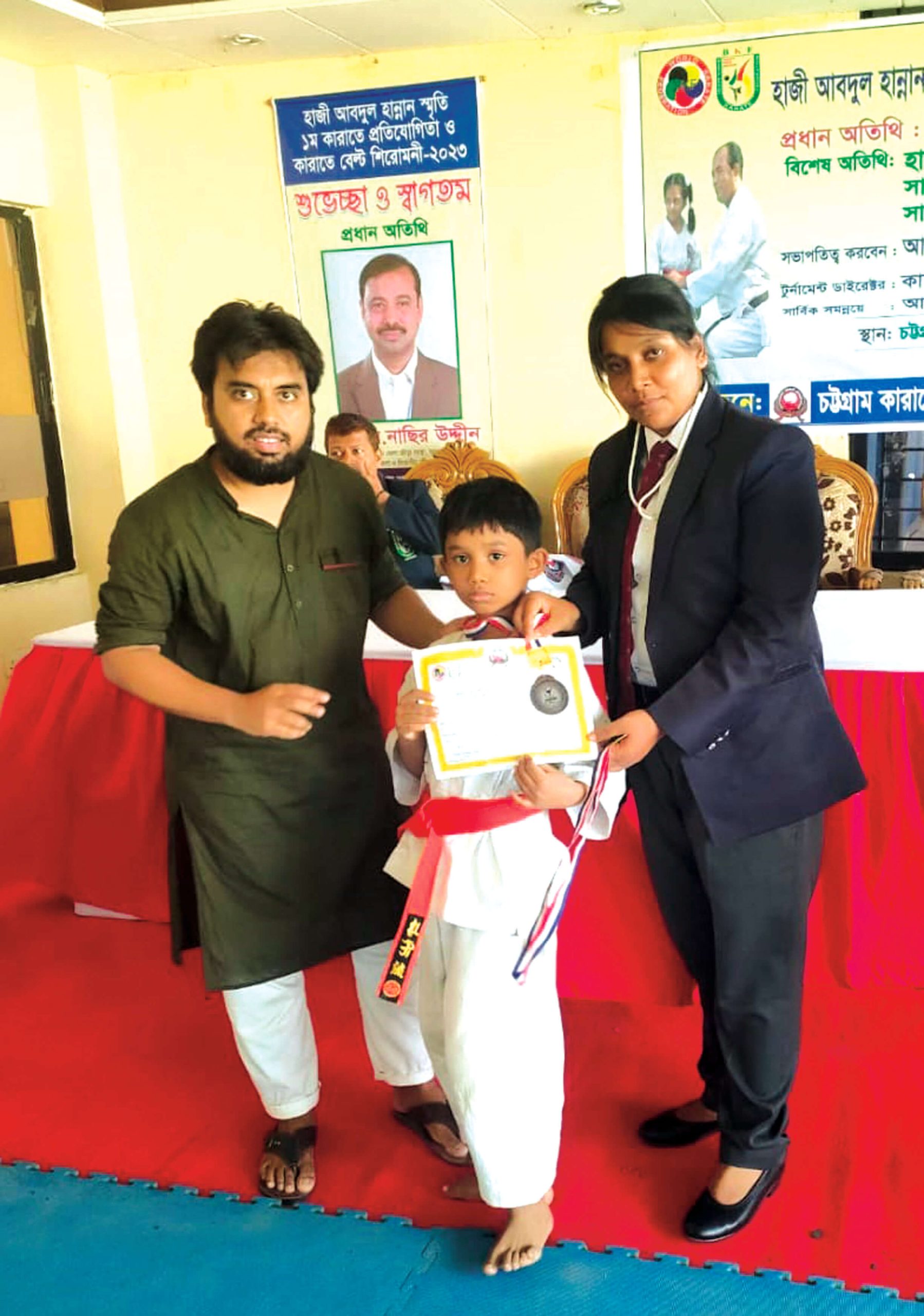 চট্টগ্রাম কারাতে এসোসিয়েশনের নিয়মিত মান যাচাইয়ে প্র্যাকটিকেল ও মৌখিক পরীক্ষা সম্পন্ন হয়েছে সম্প্রতি। আর পরীক্ষায় উত্তীর্ণ হয়ে ইন্টার অরেঞ্জ বেল্ট হতে অরেঞ্জ বেল্ট লাভ করেছে মুদাসসির রহমান রিয়াদ। তাকে বেল্ট পরিয়ে দেন ওয়ার্ল্ড এশিয়ান কারাতে জাজ ও কারাতে এসোসিয়েশনের যুগ্ম সম্পাদক লতা পারভীন। প্রেস বিজ্ঞপ্তি।