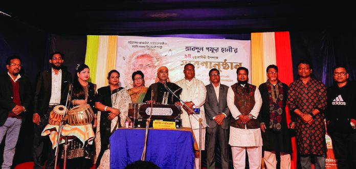 প্রত্যয় শিক্ষা ও সাংস্কৃতিক একাডেমির উদ্যোগে গতকাল শুক্রবার চট্টগ্রামের আঞ্চলিক মাইজভাণ্ডারী মরমি গানের কিংবদন্তি শিল্পী আবদুল গফুর হালীর ৯ম মৃত্যুবার্ষিকী উপলক্ষে স্মরণানুষ্ঠানের আয়োজন করা হয়েছে। প্রত্যয় শিক্ষা ও সাংস্কৃতিক একাডেমির মিলনায়তনে অনুষ্ঠিত স্মরণানুষ্ঠনে বিভিন্ন আয়োজনের মধ্যে ছিল আলোচনা, স্মৃতিচারণ এবং সংগীত সন্ধ্যা। গফুর হালীর স্মরণে এক মিনিট নীরবতা পালন করে অনুষ্ঠান শুরু করা হয়। প্রত্যয়ের নির্বাহী সদস্য এস এম হারুনর রশীদ এর সভাপতিত্বে শুরুতেই বক্তব্য রাখেন প্রত্যয়ের নির্বাহী পরিচালক আবদুল্লাহ ফারুক রবি। অনুষ্ঠানে অতিথি ছিলেন আব্দুস সাত্তার ফাউন্ডেশনের চেয়ারম্যান আবুল বশর। তিনি বলেন, আবদুল গফুর হালী আঞ্চলিক, মাইজভান্ডারী ও মরমি সংগীত স্রষ্টা। তিনি শুধু গান ও সুরের সৃষ্টি করেননি, করে গেছেন আধ্যাত্তিক চর্চাও। গুণী এ শিল্পীর সৃষ্টি আমাদের সবার কাছে তুলে ধরতে হবে। একাডেমির নির্বাহী পরিচালক আবদুল্লাহ ফারুক রবি বলেন, আবদুল গফুর হালীর সৃষ্টি সবার মাঝে তুলে ধরা আমাদের সবার দায়িত্ব। তাঁকে রাষ্ট্রীয়ভাবে সম্মান জানানো সময়ের দাবি। শিবু মল্লিকের সঞ্চালনায় স্মরণানুষ্ঠানে অতিথি হিসেবে আরো বক্তব্য রাখেন সঙ্গীত শিল্পী কল্যাণী ঘোষ, শিমুল শীল, গীতা আচার্য, রাজনীতিবিদ ইউছুপ রশীদ বেলাল, সালেহ আহমেদ হাসান বানু ফাউন্ডেশনের চেয়ারম্যান ডা. শাখাওয়াত হোসাইন হিরু, খেলাঘর চট্টগ্রাম দক্ষিণ জেলার সভাপতি অধ্যাপক ভগিরত দাশ,পটিয়া প্রেস ক্লাবের সাধারণ সম্পাদক আবদুল হাকিম রানা, কালের কন্ঠ শুভ সঙ্গের কেন্দ্রীয় কমিটির মহাসচিব রানা মিত্র, চিত্র শিল্পী হামেদ হাসান, সঙ্গীত শিল্পী মোহাম্মদ আলী আমিরী, তবলা শিল্পী নিতাই পদনাথ, আবৃত্তি শিল্পী নীহারিকা পাল, নৃত্য প্রশিক্ষক হৈমন্তী দে। বক্তারা আরো বলেন, গফুর হালী চট্টগ্রামের গান নিয়ে এতটাই কাজ করেছেন যে, চট্টগ্রামের গানের ভাণ্ডার কত ঋদ্ধ তিনি তা ইতিমধ্যেই প্রমাণ করে গেছেন। এমন গুণগ্রাহী মানুষ আমাদের বর্তমান সমাজে সচরাচর পাওয়া যায় না। তার মত বিরল প্রতিভার মানুষের কোন আদর–কদর আমাদের সমাজে নেই। সারাজীবন নিরীহ নিভৃতচারী প্রচারবিমুখ এই সাধক নিজেকে লুকিয়ে রেখেছন। প্রেস বিজ্ঞপ্তি।