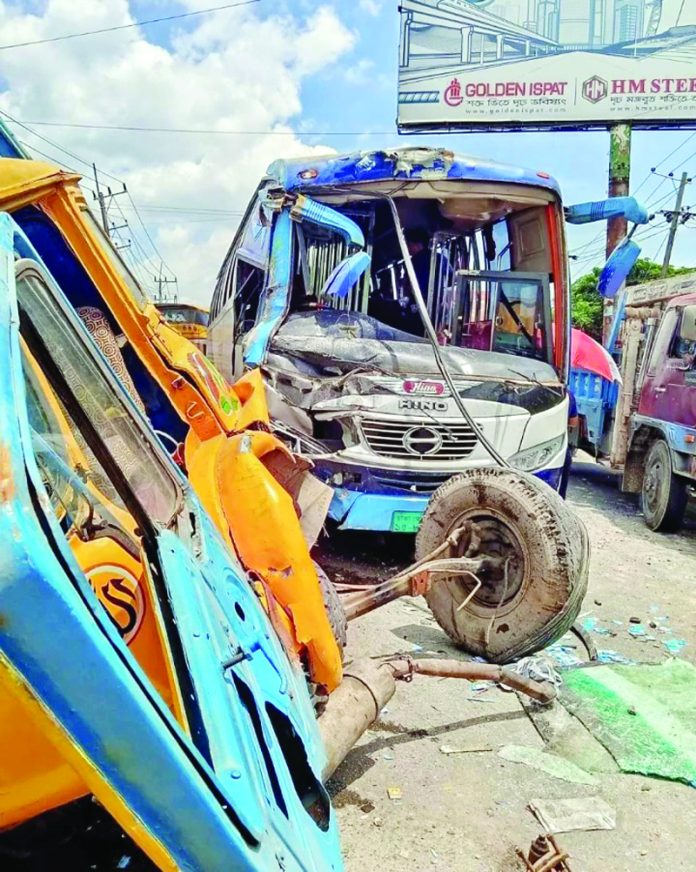 সীতাকুণ্ডে কিশোর বন্দিবাহী এক বাসে কাভার্ডভ্যানের ধাক্কায় তিন পুলিশসহ অন্তত ৭ জন আহত হয়েছেন। গতকাল সোমবার বেলা ২ টায় উপজেলার ঢাকা–চট্টগ্রাম মহাসড়কের ফৌজদারহাট বাইপাস সড়কে এ দুর্ঘটনা ঘটে। এ সময় ঢাকা–চট্টগ্রাম মহাসড়কে প্রায় ১ ঘণ্টা যানজট সৃষ্টি হয়। বার আউলিয়া হাইওয়ে থানার এসআই মো. আলমগীর বলেন, চট্টগ্রাম কারাগার থেকে বিভিন্ন বয়সের ২৩ জন কিশোর অপরাধীকে মারসা পরিবহনের একটি বাসে করে গাজীপুরের সংশোধনাগারে নিয়ে যাওয়া হচ্ছিল। বাসটি ফৌজদারহাট বাইপাস এলাকা অতিক্রমকালে লিংক রোড থেকে আসা অপর একটি কাভার্ডভ্যান নিয়ন্ত্রণ হারিয়ে আইল্যান্ড ভেঙে ঢাকামুখী ওই বাসটিকে সজোরে ধাক্কা দেয়। এতে বাসটি দুমড়ে মুচড়ে যাওয়ার পাশাপাশি বাসে থাকা পুলিশসহ ৭ জন গুরুতর আহত হন। তবে তাৎক্ষণিক আহতদের নাম–পরিচয় পাওয়া যায়নি। আহতদের উদ্ধার করে হাসপাতালে পাঠানো হয়েছে।