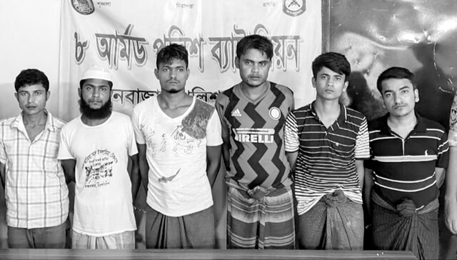 আটককৃতরা হলেন, উখিয়ার বালুখালী ৮ ওয়েস্ট রোহিঙ্গা ক্যাম্পের আব্দুল হাকিমের ছেলে মোহাম্মদ ফোরকান (২৩), খাইরুল বশরের ছেলে মোহাম্মদ জুবায়ের (২৯), মৃত ফকির আহমদের ছেলে বি রহমান (৩৪), উখিয়ার ৯ নম্বর রোহিঙ্গা ক্যাম্পের মোস্তাক আহমেদের ছেলে এনাম উল্লাহ (২৩), একই ক্যাম্পের শাকের উল্লাহর ছেলে এবাদত উল্লাহ (২৫) এবং উখিয়ার ১০ নম্বর রোহিঙ্গা ক্যাম্পের বাসিন্দা মোহাম্মদ শাকেরের ছেলে আরিফ উল্লাহ (৩০)।