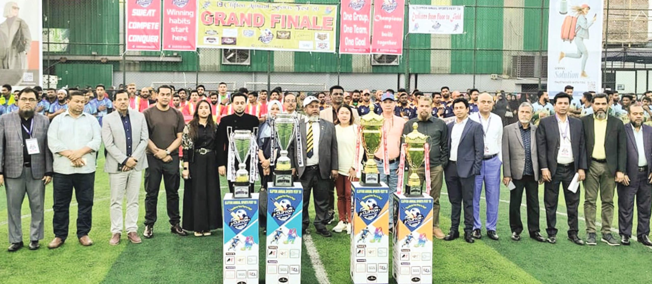 ক্লিফটন গ্রুপের বার্ষিক ক্রীড়া উৎসবের গ্র্যান্ড ফাইনাল গত ২৬ জানুয়ারি নাসিরাবাদ অক্সিজেন স্পোর্টস জোনে সম্পন্ন হয়েছে। টুর্নামেন্টের গ্র্যান্ড ফাইনালে ফুটবল ইভেন্টে ডিএফএল ডমিনেটর ১–০ গোলে ডাইয়িং সুপার কিংসকে হারিয়ে চ্যাম্পিয়ন হওয়ার গৌরব অর্জন করে। অপরদিকে ক্রিকেট টুর্নামেন্টে প্রতিদ্বন্দ্বিতাপূর্ণ খেলায় সিটিএএল ফাইটারস ৯ উইকেটে কিথ ভরটেক্সকে পরাজিত করে চ্যাম্পিয়ন হয়। গ্র্যান্ড ফাইনাল ও পুরস্কার বিতরণী অনুষ্ঠানে অতিথি ছিলেন ক্লিফটন গ্রুপের চেয়ারম্যান প্রফেসর কামাল উদ্দিন চৌধুরী, সিইও এমডি এম মহিউদ্দিন চৌধুরী, ক্লিফটন গ্রুপের পরিচালকবৃন্দ আলী হায়দার চৌধুরী, জয়নুল আবেদিন চৌধুরী, মিনহাজুল আবেদিন চৌধুরী, রিদুয়ানুল আবেদিন চৌধুরী, ফারহাদ জাহান চৌধুরী, নিলুফার জাহান চৌধুরী, সৈয়দা জাহানারা বেগম। এসময় উপস্থিত ছিলেন বিজিএমইএ’র সাবেক পরিচালক খন্দকার বেলায়েত হোসেন, বিজিএমইএ পরিচালক সাইফউল্লাহ মনসুর, ক্লিফটন গ্রুপের পরিচালক (মার্চেন্ডাইজিং) আশুতোষ বিশ্বাস, নির্বাহী পরিচালক আয়েশা চৌধুরী মাইশা, নির্বাহী পরিচালক কৃষ্ণপদ দাশ, চীফ কনভেনার ও পরিচালক অপারেশন্স আতিকুর রহমান, সিজেকেএস সদস্য সৈয়দ গিয়াসউদ্দীন মাহমুদ হেলাল। এছাড়াও ক্লিফটন গ্রুপের বিভিন্ন ইউনিটের ঊর্ধ্বতন কর্মকর্তারা উপস্থিত ছিলেন। অতিথিবৃন্দ ফুটবল ও ক্রিকেট উভয় বিভাগের বিজয়ী ও রানার্স–আপ দলের খেলোয়াড়দের হাতে ট্রফি ও পুরস্কার তুলে দেন।
