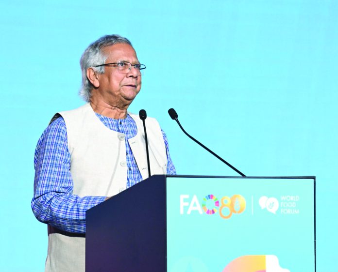 অধ্যাপক ইউনূস বলেন, বাংলাদেশ আজ ১৭ কোটি মানুষের খাদ্য নিশ্চিত করছে এবং মিয়ানমারের সহিংসতা থেকে পালিয়ে আসা ১৩ লাখ রোহিঙ্গাকেও আশ্রয় ও খাদ্য সহায়তা দিচ্ছে। আমরা ধান উৎপাদনে স্বয়ংসম্পূর্ণ হয়েছি। বিশ্বের শীর্ষ দেশগুলোর মধ্যে আছি ধান, সবজি ও স্বাদু পানির মাছ উৎপাদনে। কৃষকরা ফসলের নিবিড়তা ২১৪ শতাংশে উন্নীত করেছেন এবং আমরা জলবায়ুুসহনশীল ১৩৩ প্রজাতির ধান উদ্ভাবন করেছি। আমরা কৃষিতে যান্ত্রিকীকরণ করেছি, ৭০ শতাংশ পর্যন্ত ভর্তুকি দিচ্ছি, শক্তিশালী খাদ্য বিতরণ ব্যবস্থা গড়ে তুলেছি, অপুষ্টি কমিয়েছি, খাদ্যাভ্যাসে বৈচিত্র্য এনেছি এবং কৃষিকে সবুজ করেছি। মাটি, পানি ও জীববৈচিত্র্য সংরক্ষণে কাজ করছি।