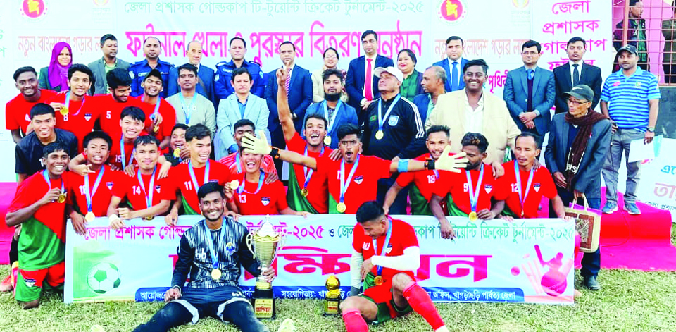 খাগড়াছড়ি জেলা প্রশাসনের আয়োজনে জেলা প্রশাসক গোল্ডকাপ ফুটবল টুর্নামেন্ট ও জেলা প্রশাসক গোল্ডকাপ টি টুয়েন্টি ক্রিকেট টুর্নামেন্টের ফাইনাল খেলা ও পুরস্কার বিতরণ অনুষ্ঠিত হয়েছে। খাগড়াছড়ি জেলা স্টেডিয়ামে গতকাল ৮ জানুয়ারি বিকেলে প্রধান অতিথি হিসেবে উপস্থিত থেকে পুরস্কার বিতরণ করেন খাগড়াছড়ি জেলা প্রশাসক মো. আনোয়ার সাদাত। গত ২৭ জানুয়ারি শুরু হওয়া ফুটবল টুর্নামেন্টে চ্যাম্পিয়ন হয় মাটিরাঙ্গা উপজেলা। রানার্সআপ হয় খাগড়াছড়ি সদর উপজেলা। ফাইনালে নির্ধারিত সময়ের খেলা ১–১ গোলে ড্র থাকায় টাইব্রেকারে ৫–৪ গোলে মাটিরাঙ্গা উপজেলা বিজয়ী হয়। সর্বোচ্চ গোলদাতার পুরস্কার লাভ করেন গুইমারা উপজেলার উস্যি মারমা। তিনি ৩টি গোল করেন। সেরা গোলকিপারের পুরস্কার লাভ করেন খাগড়াছড়ি পৌরসভার তানিউং মারমা, সেরা খেলোয়াড় হন সদর উপজেলার রাসেল ত্রিপুরা। ম্যান অব দ্যা ফাইনাল হন মাটিরাঙ্গা উপজেলার মো. শরীফ হোসেন। টি–টোয়েন্টি ক্রিকেট টুর্নামেন্টে চ্যাম্পিয়ন হয় দিঘীনালা উপজেলা। ফাইনালে তারা ৮ রানে সদর উপজেলাকে পরাজিত করে। সকালে টস জিতে প্রথমে ফিল্ডিংয়ের সিদ্ধান্ত নেয় সদর উপজেলা। দিঘীনালা উপজেলা প্রথমে ব্যাটিং করে নির্ধারিত ২০ ওভারে ৩ উইকেট হারিয়ে ১৩৩ রান করে। ১৩৪ রানের টার্গেটে খেলতে নেমে সদর উপজেলা ২০ ওভারে ১২৫ রান করে ৭ উইকেটের বিনিময়ে। টুর্নামেন্টের সর্বোচ্চ রান সংগ্রহকারী দিঘীনালা উপজেলার আনোয়ারুল আবেদিন কায়েস(৯১ রান), সর্বোচ্চ উইকেট শিকার করেন দুইজন (৬ উইকেট) দিঘীনালা উপজেলার তন্ময় ও মহালছড়ি উপজেলার সাকিব। ম্যান অব দ্যা টুর্নামেন্ট হন দিঘীনালা উপজেলার আনোয়ারুল আবেদিন কায়েস (৯১ রান ও ৫ উইকেট)। ম্যান অব দ্যা ফাইনাল হন দিঘীনালা উপজেলার তন্ময়। অনুষ্ঠানে অতিরিক্ত জেলা প্রশাসক (সার্বিক) হাসান মারুফের সভাপতিত্বে বিশেষ অতিথি ছিলেন খাগড়াছড়ি জেলা প্রশানের ডিডিএলজি ও খাগড়াছড়ি পৌরসভার প্রশাসক সাজিয়া তাহের, অতিরিক্ত পুলিশ সুপার শাহাদাত হোসেন, অতিরিক্ত পুলিশ সুপার কামরুল ইসলাম, বিজ্ঞ অতিরিক্ত জেলা ম্যাজিস্ট্রেট মো. মোস্তফা জাবেদ কায়সার, অতিরিক্ত জেলা প্রশাসক (শিক্ষা ও আইসিটি) রুমানা আক্তার, সদর উপজেলা নির্বাহী অফিসার ফারিয়া সুলতানা, মাটিরাঙ্গা উপজেলা নির্বাহী অফিসার মাহমুদুর রহমান, দিঘীনালা উপজেলা নির্বাহী অফিসার তানজিল পারভেজ, খাগড়াছড়ি সরকারি মহিলা কলেজের অধ্যক্ষ পুলক বরণ চাকমা, মাটিরাঙ্গা সরকারি ডিগ্রি কলেজের অধ্যক্ষ প্রদীপ কুমার দাশ, খাগড়াছড়ি জেলা প্রশাসনের নির্বাহী ম্যাজিস্ট্রেটবৃন্দ, খাগড়াছড়ি জেলা ক্রীড়া অফিসার ও জেলা ক্রীড়া সংস্থার মেম্বার সেক্রেটারি হারুন অর রশিদ, জেলা ক্রীড়া সংস্থার এড
