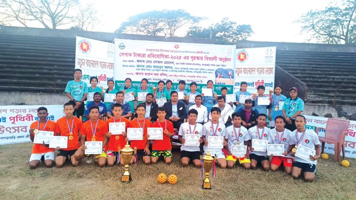 তারুণ্যের উৎসব ২০২৫ উদযাপন উপলক্ষে খাগড়াছড়ি পার্বত্য জেলা পরিষদ ও জেলা ক্রীড়া অফিসের আয়োজনে সেপাক টাকরো টুর্নামেন্টের পুরস্কার ও সার্টিফিকেট বিতরণ সম্পন্ন হয়। গত ১৮ ডিসেম্বর বিকালে খাগড়াছড়ি স্টেডিয়ামে প্রতিযোগিতা শেষে প্রধান অতিথি হিসেবে উপস্থিত থেকে পুরস্কার বিতরণ করেন খাগড়াছড়ি জেলা জেলা পরিষদের মূখ্য নির্বাহী কর্মকর্তা (উপসচিব) মো. নোমান হোসেন। জেলা ক্রীড়া অফিসার হারুন অর রশিদের সভাপতিত্বে বিশেষ অতিথি ছিলেন খাগড়াছড়ি পার্বত্য জেলা পরিষদের সদস্য ও জেলা ক্রীড়া বিভাগ, যুব উন্নয়ন, জনস্বাস্থস্থ্য প্রকৌশল অধিদপ্তরের আহ্বায়ক মো. মাহাবুব আলম, জেলা ক্রীড়া সংস্থার এডহক কমিটির সদস্য মো. নজরুল ইসলাম,জ্যৈতিষ বসু ত্রিপুরা, আনিসুল ইসলাম চৌধুরী আনিক ও মাদল বড়ুয়া।