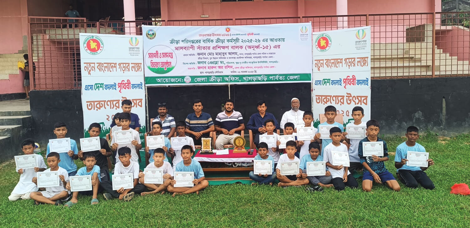 তারুণ্যের উৎসব উদযাপন উপলক্ষে ক্রীড়া পরিদপ্তরের বার্ষিক ক্রীড়া কর্মসূচির আওতায় খাগড়াছড়ি জেলা ক্রীড়া অফিসের আয়োজনে অ১৫ সাঁতার প্রশিক্ষণের সমাপনী ও পুরস্কার বিতরণ সম্পন্ন হয়েছে। গত ১ নভেম্বর বিকালে খাগড়াছড়ি স্টেডিয়ামে প্রধান অতিথি হিসেবে উপস্থিত থেকে সনদপত্র বিতরণ করেন খাগড়াছড়ি পার্বত্য জেলা পরিষদের সদস্য, জেলা ক্রীড়া বিভাগ,যুব উন্নয়ন অধিদপ্তর ও জনস্বাস্থ্য প্রকৌশল অধিদপ্তরের আহবায়ক মো. মাহাবুব আলম। অনুষ্ঠানে খাগড়াছড়ি জেলা ক্রীড়া অফিসার হারুন অর রশিদের সভাপতিত্বে বিশেষ অতিথি হিসেবে উপস্থিত ছিলেন খাগড়াছড়ি জেলা ক্রীড়া সংস্থার এডহক কমিটির সদস্য মাদল বড়ুয়া, রাকিব মনি ইফতি, কোচ উজ্জ্বল মারমা। প্রশিক্ষণ থেকে ৫ জন প্রতিভাবান সাঁতারু বাছাই করা হয়। তারা হল হ্লাপ্রুসি মারমা, উচিংমং মারমা, অংখেং মারমা, খাংমং সিং চৌধুরী, ক্যাশিও মারমা।