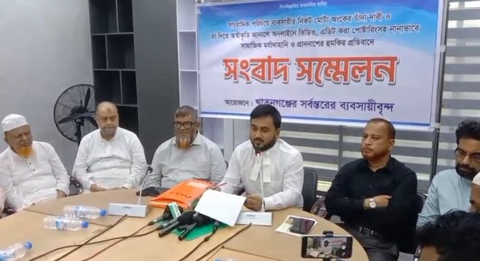খাতুনগঞ্জে মোহাম্মদ মোসলেম উদ্দিন নামের এক ব্যবসায়ীর কাছে সাংবাদিক পরিচয়ে চাঁদা দাবি ও হয়রানির প্রতিবাদে সংবাদ সম্মেলন করেছে ব্যবসায়ীদের একটি পক্ষ। গতকাল বিকেলে খাতুনগঞ্জের এমএস ট্রেড সেন্টারে ভুক্তভোগী মোসলেম উদ্দিনের পক্ষে আয়োজিত সংবাদ সম্মেলনে লিখিত বক্তব্য পাঠ করেন অ্যাডভোকেট আবদুল্লাহ আল গালীব।
