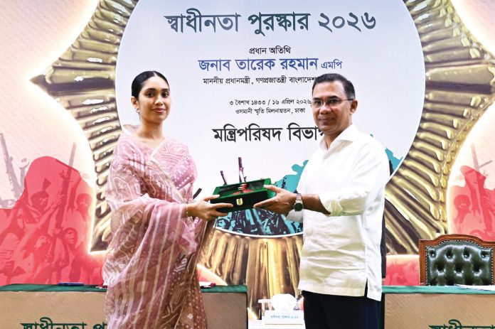 সাবেক প্রধানমন্ত্রী খালেদা জিয়াসহ ১৫ ব্যক্তি এবং পাঁচটি প্রতিষ্ঠানকে দেশের সর্বোচ্চ বেসামরিক সম্মাননা ‘স্বাধীনতা পুরস্কার’ দিল সরকার। জাতীয় পর্যায়ে গৌরবোজ্জ্বল ও কৃতিত্বপূর্ণ অবদানের স্বীকৃতিতে গতকাল বৃহস্পতিবার বিকালে এ বছরের মনোনীতদের পদক তুলে দেন প্রধানমন্ত্রী তারেক রহমান। ওসমানী স্মৃতি মিলনায়তনে এ অনুষ্ঠান আয়োজন করে মন্ত্রিপরিষদ বিভাগ। সাবেক প্রধানমন্ত্রী খালেদা জিয়ার মরণোত্তর পদক গ্রহণ করেন তার নাতনি জাইমা রহমান। তিনি দাদুর পদক গ্রহণ করেন প্রধানমন্ত্রীর হাত থেকে। খবর বিডিনিউজের।