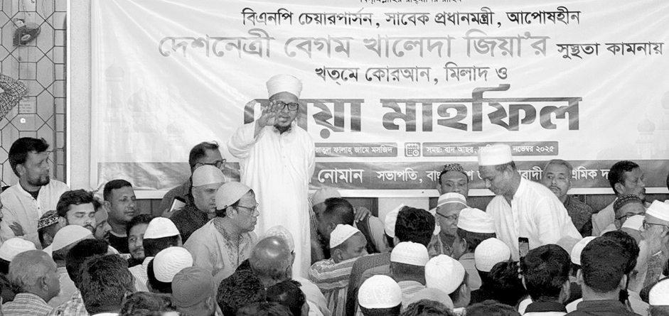 দোয়া মাহফিলে বেগম খালেদা জিয়ার দ্রুত আরোগ্য, দীর্ঘায়ু এবং সুস্বাস্থ্য কামনা করে বিশেষ মোনাজাত পরিচালিত হয়। পাশাপাশি দেশ, জাতি ও মানবতার কল্যাণ কামনাও করা হয়। মাহফিলে সাঈদ আল নোমান বলেন, বেগম খালেদা জিয়া বাংলাদেশের গণতান্ত্রিক আন্দোলনের প্রতীক। তার সুস্থতা শুধু বিএনপি নয়, সমগ্র জাতির প্রত্যাশা। প্রেস বিজ্ঞপ্তি।