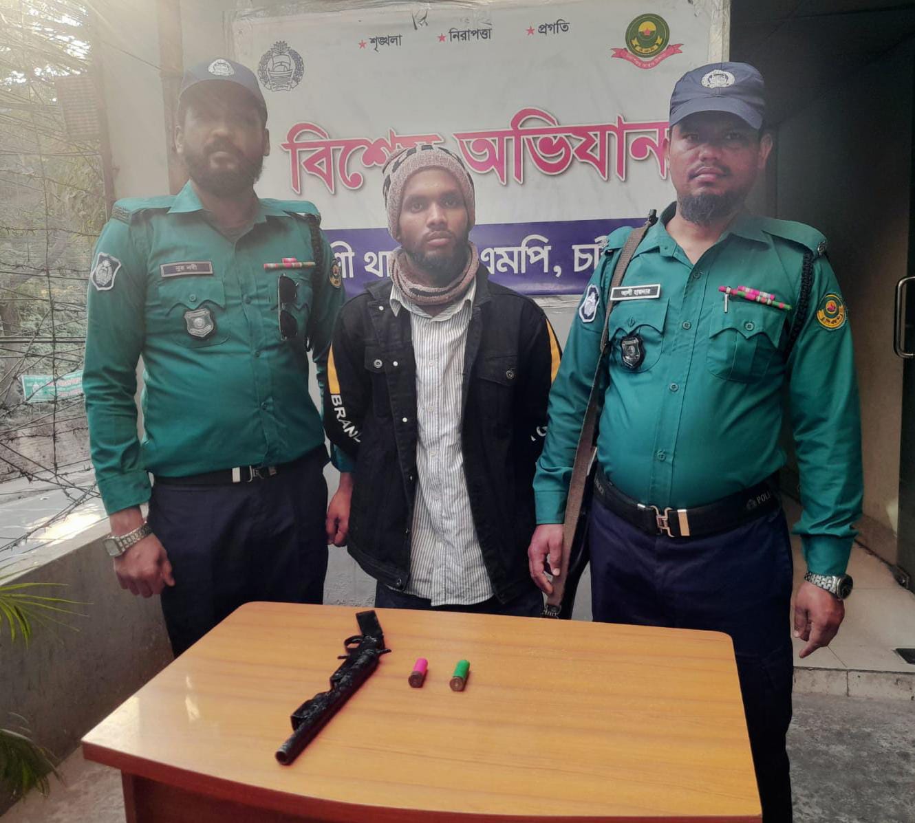 তার কাছ থেকে একটি কালো রঙের স্টিলের বাটযুক্ত দেশীয় তৈরি একনলা বন্দুক, একটি লাল রঙের কার্তুজ ও একটি সবুজ রঙের খালি কার্তুজ উদ্ধার করা হয়েছে।