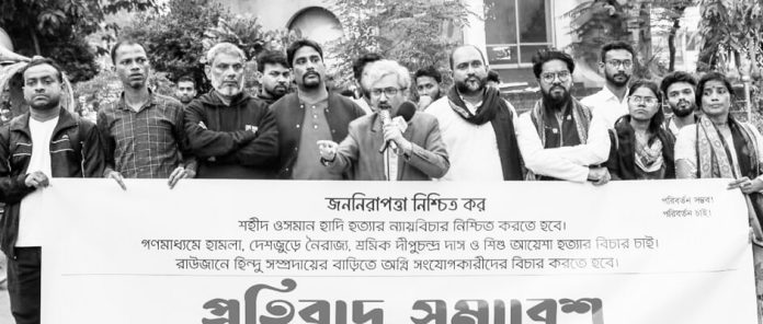 ওসমান হাদি হত্যার ন্যায়বিচার নিশ্চিত করা, গণমাধ্যমে ধারাবাহিক হামলা, দেশজুড়ে নৈরাজ্য, শ্রমিক দীপু চন্দ্র দাস ও শিশু আয়েশা হত্যার বিচার এবং রাউজানে হিন্দু সম্প্রদায়ের বাড়িতে অগ্নিসংযোগের ঘটনায় দায়ীদের দৃষ্টান্তমূলক শাস্তির দাবিতে গণসংহতি আন্দোলন চট্টগ্রাম মহানগরের উদ্যোগে বিক্ষোভ সমাবেশ গতকাল মঙ্গলবার নগরীর চেরাগী পাহাড়ে অনুষ্ঠিত হয়। এতে সভাপতিত্ব করেন গণসংহতি আন্দোলন চট্টগ্রাম মহানগরের যুগ্ম সমন্বয়কারী হাসান মুরাদ শাহ। সঞ্চালনা করেন নির্বাহী সমন্বয়কারী মোঃ মোরশেদুল আলম। সমাবেশে বক্তব্য রাখেন গণসংহতি আন্দোলনের রাজনৈতিক পরিষদের সদস্য সৈয়দ মোহাম্মদ হাসান মারুফ রুমি, উত্তর জেলার সমন্বয়কারী নাসির উদ্দিন তালুকদার, নির্বাহী সমন্বয়কারী ইঞ্জি. জাহিদুল আলম, মহানগর সম্পাদকমণ্ডলীর সদস্য সাধন দত্ত, মহানগর সদস্য কলি কায়েয, ফয়সাল উদ্দিন নয়ন, মো. জাহেদ হাসান, মো. মামুন, যুব ফেডারেশন চট্টগ্রাম মহানগরের আহ্বায়ক মারুফ হোসেন, ছাত্র ফেডারেশনের তাহমিদুল ইসলাম তামিম ও শওকত ওসমান তৌকির, শাকিব মাহাতাব রামি প্রমুখ। জননিরাপত্তা নিশ্চিত করার দাবি জানিয়ে বক্তারা বলেন, ছায়ানট, উদীচী, প্রথম আলো ও ডেইলি স্টারের মতো প্রতিষ্ঠানের ওপর সংঘটিত হামলা গণতন্ত্র ও মতপ্রকাশের স্বাধীনতার ওপর সরাসরি আঘাত। শরিফ ওসমান হাদির মৃত্যুর ঘটনায় দেশজুড়ে মানুষ শোকাহত ও বিচারপ্রার্থী থাকলেও একটি সংগঠিত দঙ্গল সেই শোককে পুঁজি করে পরিকল্পিতভাবে এসব প্রতিষ্ঠানে হামলা চালিয়েছে। সিসিটিভি ফুটেজে শনাক্ত সকল হামলাকারীকে অবিলম্বে গ্রেপ্তার করার জোরালো দাবি জানানো হচ্ছে। আমরা কোনো হিংসা–প্রতিহিংসার রাজনীতি চাই না। দেশকে অস্থিতিশীল করতে যারা সচেষ্ট তাদের কঠোর ও দৃষ্টান্তমূলক বিচার চাই। প্রেস বিজ্ঞপ্তি।