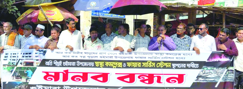 খাগড়াছড়ি গুইমারা উপজেলায় পূর্ণাঙ্গ উপজেলা স্বাস্থ্য কমপ্লেক্স ও ফায়ার সার্ভিস সিভিল ডিফেন্স স্টেশন স্থাপনের দাবিতে মানববন্ধন করেছে এলাকাবাসী। গতকাল শুক্রবার সকাল ১০ টায় গুইমারা বাজারে এই মানববন্ধন অনুষ্ঠিত হয়। এ সময় বক্তারা বলেন, ২০১৫ সালে উপজেলা গঠনের পরও এখানে কোনো স্বাস্থ্য কমপ্লেঙ না থাকায় রোগীদের চিকিৎসার জন্য যেতে হয় দূরের হাসপাতালে। এতে সময়ক্ষেপণের কারণে অনেক সময় প্রাণহানির ঘটনাও ঘটে। একইভাবে ফায়ার সার্ভিস স্টেশন না থাকায় আগুন লাগলে দ্রুত উদ্ধার কার্যক্রম পরিচালনা সম্ভব হয় না। গুইমারা উপজেলার মো. ইউসুফের উদ্যোগে আলাউদ্দিন আরিফের সঞ্চালনায় মানববন্ধনে বক্তব্য রাখেন তিন ইউনিয়নের প্রতিনিধি আবুল বাশার, মাহবুব আলী, জাহাঙ্গীর আলম, স্বপন চক্রবর্তী, মাওলানা ওসমান গনি, চাইরেপ্রু মারমা, সাংবাদিক মাঈন উদ্দিন বাবলু ও আব্দুল আলী, জনপ্রতিনিধি হরিপদ ত্রিপুরা ও আরমান হোসাইন, আবু বক্কর, মাগফার হোসেন এবং সাইফুল ইসলাম সোহাগ।