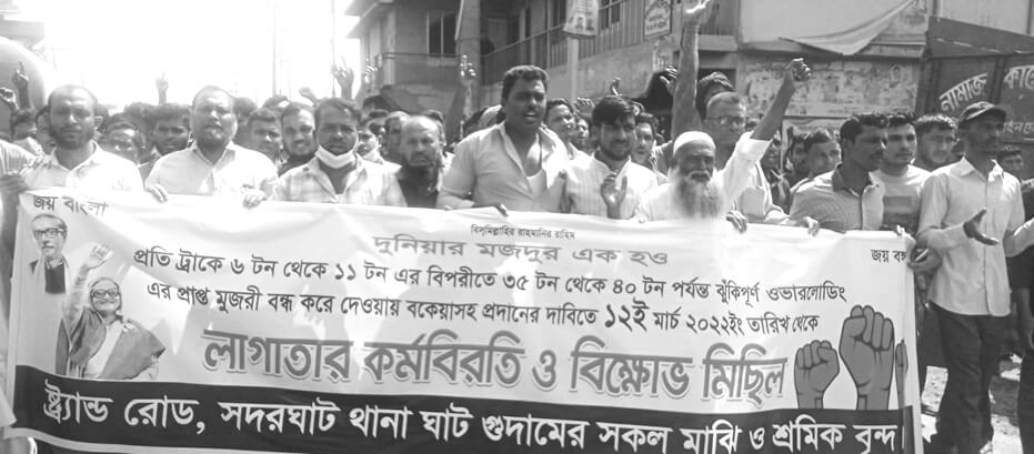 ওভারলোডিংয়ের প্রাপ্ত মজুরি ও বকেয়া প্রদানসহ কয়েকটি দাবিতে লাগাতার কর্মবিরতি পালনের ঘোষণা দিয়েছে চট্টগ্রামের ঘাট গুদাম মাঝি ও শ্রমিকরা। নগরীর সদরঘাট থানার বাংলাবাজার এলাকায় ঘাট-গুদাম শ্রমিক সংগ্রাম পরিষদের কার্যালয়ের সামনে এক বিক্ষোভ সমাবেশ থেকে এ ঘোষণা দেয়া হয়।
