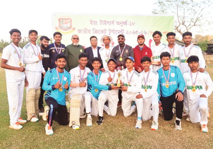 ইয়ং টাইগার্স অনূর্ধ্ব–১৮ জাতীয় ক্রিকেট চ্যাম্পিয়নশিপের বিভাগীয় পর্যায়ের ফাইনালে নিজেদের মাঠেই হেরে গেছে চট্টগ্রাম জেলা দল। গতকাল বৃহস্পতিবার হাটহাজারীস্থ কন্টিনেন্টাল স্পোর্টস কমপ্লেক্স মাঠে অনুষ্ঠিত ফাইনাল খেলায় চাঁদপুর জেলা দল ৬ উইকেটে চট্টগ্রাম জেলা দলকে পরাজিত করে। ফাইনালে স্বাগতিক চট্টগ্রাম তাদের সক্ষমতা দেখাতে পুরো ব্যর্থ হয়। টসে জিতে এদিন চাঁদপুর প্রথমে ব্যাট করতে পাঠায় চট্টগ্রামকে। চট্টগ্রাম পুরো ৫০ ওভার খেলার আগেই অল আউট হয়ে যায়। ৩৫.২ ওভার খেলে তারা ১২৮ রানের মামুলি সংগ্রহ দাঁড় করায় চাঁদপুরের সামনে। শুরুতে উইকেট হারিয়ে ইনিংসের মাঝপথে কিছুটা দৃঢ়তা দেখালেও যথেষ্ট রান সংগ্রহ করতে ব্যর্থ হয় তারা। দলের পক্ষে ওপেনার মো. আবিদ ২০, সিয়ামুল আওয়াল ২১,ওয়াহিদ মুরাদ ২১, মোহাম্মদ জুনাইদ ১৫ এবং ফাইরিব হুমায়ুন অহন ১৪ রান করেন। ১০ নম্বরে খেলতে নামা ইমরান হোসেন সামি ২০ বলে ১৭ রান করে অপরাজিত থাকেন। অতিরিক্ত থেকে জমা হয় ১২।