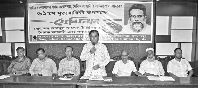 দৈনিক আজাদীর প্রতিষ্ঠাতা সম্পাদক ইঞ্জিনিয়ার মোহাম্মদ আবদুল খালেকের ৬১তম মৃত্যুবার্ষিকী উপলক্ষে গতকাল নগরীর প্রেসক্লাবের এস রহমান হলে ‘মোহাম্মদ আবদুল খালেক ইঞ্জিনিয়ার, দৈনিক আজাদী এবং গণতন্ত্র’ শীর্ষক সেমিনার অনুষ্ঠিত হয়েছে। বাংলাদেশ মানবাধিকার সাংবাদিক সংস্থা অনুষ্ঠানের আয়োজন করে। সংস্থার সভাপতি সাংবাদিক এস এম জামাল উদ্দিনের সভাপতিত্বে সেমিনারে মুখ্য আলোচক ছিলেন বাংলাদেশ প্রেস কাউন্সিলের সাবেক সদস্য মইনুদ্দীন কাদেরী শওকত।