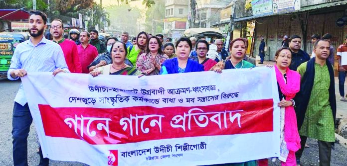 উদীচী ও ছায়ানটে ধ্বংসযজ্ঞ, গণমাধ্যমসহ বিভিন্ন প্রতিষ্ঠানে হামলা, সংস্কৃতি চর্চায় বাধা ও মব সন্ত্রাসের বিরুদ্ধে ‘গানে গানে প্রতিবাদ’ পদযাত্রা কর্মসূচি পালন করেছে উদীচী চট্টগ্রাম জেলা সংসদ। পদযাত্রা–পরবর্তী সমাবেশে দেশবিরোধী উগ্রবাদী শক্তিকে মোকাবেলায় সর্বস্তরের জনতার ঐক্যের আহ্বান জানানো হয়েছে।