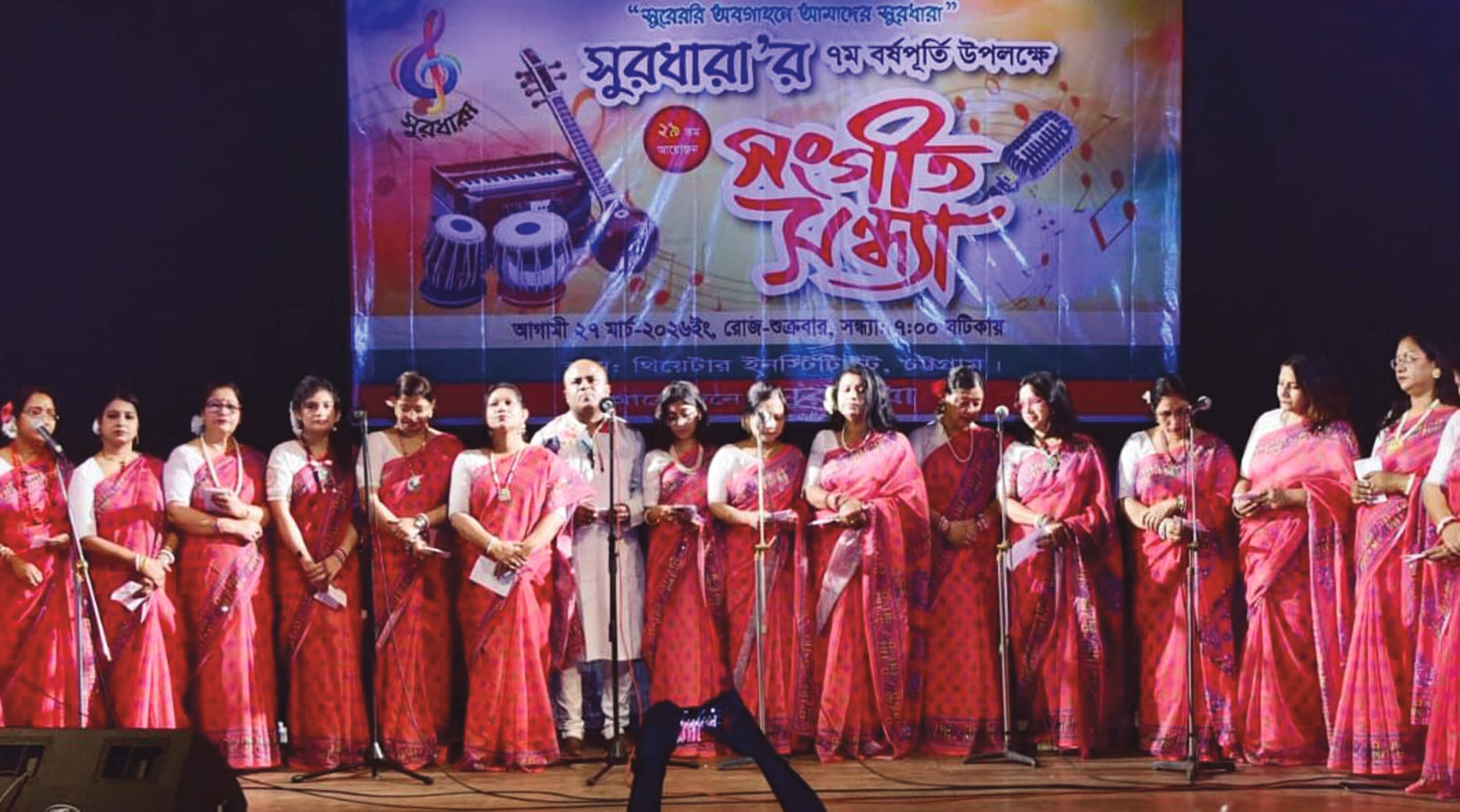 নান্দনিক সুর আর শুদ্ধ সংগীতের মূর্ছনায় বন্দরনগরী চট্টগ্রামে উদযাপিত হলো সাংস্কৃতিক সংগঠন ‘সুরধারা’র ৭ম বর্ষপূর্তি। শুক্রবার (২৭ মার্চ) সন্ধ্যায় নগরীর থিয়েটার ইনস্টিটিউট মিলনায়তনে সংগঠনের ২৯তম আয়োজনে এই বর্ণাঢ্য সংগীত ও নৃত্য সন্ধ্যার আয়োজন করা হয়। অনুষ্ঠানের শুরুতে সংগঠনের পক্ষ থেকে আমন্ত্রিত অতিথি তাঁর স্বাগত বক্তব্যে সুরধারার সাত বছরের পথচলার প্রশংসা করেন এবং শুদ্ধ সংস্কৃতি চর্চায় তরুণ প্রজন্মকে উৎসাহিত করার আহ্বান জানান। সম্পূর্ণ অনুষ্ঠানটি অত্যন্ত দক্ষতার সাথে সঞ্চালনা করেন সিমলা চৌধুরী। সংগীত সন্ধ্যায় উদ্বোধনী সংগীতের পর একে একে মঞ্চে আসেন সংগঠনের একঝাঁক প্রতিভাবান শিল্পী। তাঁরা হলেন– শুভাগত চৌধুরী (অ্যাডভোকেট), সুমিত্রা বিশ্বাস, সীমা পাল, অর্পিতা দাশ, রূপা দত্ত, সনজিতা ভট্টাচার্য, পৃথ্বীশ ভট্টাচার্য, শিউলী নাথ, বহ্নিশিখা রক্ষিত, পাপড়ি ভট্টাচার্য, ঋতু দত্ত, আলপনা বড়ুয়া, লিখি দাশ, দীপাশ্রী দে, সুপ্রিয়া চৌধুরী, বিশাখা নন্দী, মাধবী চৌধুরী, শাশ্বত বিশ্বাস, অনিন্দিতা সেন গুপ্ত, চুমকি পালিত, আঁখি সেন, ত্রিপর্ণা চৌধুরী ও অরুন্ধুতী চৌধুরী। শিল্পীরা হেমন্ত মুখোপাধ্যায়, লতা মঙ্গেশকর, মান্না দে ও সন্ধ্যা মুখোপাধ্যায়ের মতো কালজয়ী শিল্পীদের জনপ্রিয় গানগুলো পরিবেশন করে দর্শকদের মুগ্ধ করেন। অনুষ্ঠানে মোহময় নৃত্য পরিবেশন করে দর্শকদের বিশেষ দৃষ্টি আকর্ষণ করেন নৃত্যাশিল্পী সৃজয়ী রুদ্র ও সায়ন্তিকা দত্ত। যন্ত্রসংগীতে সহযোগিতা করেন নিখিলেশ বড়ুয়া (কি–বোর্ড), জয়ন্ত দেব (তবলা), এম. এস. শাহজাহান (বাঁশি), অনূজিত বড়ুয়া লিমন (অক্টোপ্যাড), শ্যামল চন্দ্র দাস (বেহালা) এবং রেন্টু সুকেশ (অ্যাকুস্টিক গিটার)। সংগঠনের পরিচালক এ্যাড. শুভাগত চৌধুরী সমাপনী বক্তব্যে বলেন, সুরের মাধ্যমে মানুষের মনে প্রশান্তি ছড়িয়ে দেওয়াই আমাদের লক্ষ্য। দীর্ঘ সাত বছর ধরে দর্শকদের যে ভালোবাসা আমরা পেয়েছি, তা আগামী দিনেও আমাদের পথ চলতে শক্তি জোগাবে। অনুষ্ঠান শেষে সকল শিল্পী, নৃত্যশিল্পী, যন্ত্রশিল্পী ও অতিথিদের নিয়ে একটি স্মৃতিস্মারক আলোকচিত্র ধারণ করা হয়। চট্টগ্রামের বিশিষ্ট ব্যক্তিবর্গ ও বিপুল সংখ্যক সংগীতানুরাগী এই অনুষ্ঠানটি প্রাণভরে উপভোগ করেন।