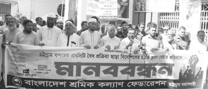 তিনি গতকাল শনিবার চট্টগ্রাম প্রেসক্লাব চত্বরে বাংলাদেশ শ্রমিক কল্যাণ ফেডারেশন মহানগরের উদ্যোগে চট্টগ্রাম বন্দরের এনসিটি আন্তর্জাতিক দরপত্র ছাড়া বিদেশিদের হাতে তুলে দেওয়ার প্রতিবাদে মানববন্ধনে সভাপতির বক্তব্যে এসব কথা বলেন। মহানগরীর সাধারণ সম্পাদক আবু তালেব চৌধুরীর সঞ্চালনায় এতে বক্তব্য দেন, নগর ফেডারেশন নেতা হামিদুল ইসলাম, মুহাম্মদ নুরুন্নবী, মুহাম্মদ জাহাঙ্গীর আলম, মনিরুল ইসলাম মজুমদার, ইঞ্জিনিয়ার সাইফুল ইসলাম, বন্দর ইসলামী শ্রমিক সংঘের সভাপতি মুহাম্মদ হেলাল উদ্দিন, সাধারণ সম্পাদক মুহাম্মদ ইয়াছিন, বন্দর থানা সভাপতি মুজাহিদুল ইসলাম আদনান প্রমুখ। প্রেস বিজ্ঞপ্তি।