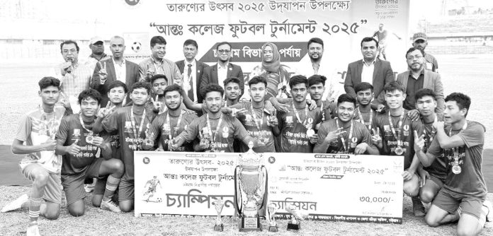 চট্টগ্রাম বিভাগীয় আন্তঃকলেজ ফুটবল টুর্নামেন্টের শিরোপা জিতে নিয়েছে খাগড়াছড়ির মাটিরাঙ্গা কলেজ। গতকাল বুধবার দুপুরে চট্টগ্রাম জেলা স্টেডিয়ামে অনুষ্ঠিত টুর্নামেন্টের চূড়ান্ত খেলায় মাটিরাঙ্গা কলেজ টাইব্রেকারে খাগড়াছড়ির পানছড়ি কলেজকে পরাজিত করে। এবার খাগড়াছড়ির দুটো দলই খেলেছে ফাইনালে খেলেছে। গতকাল খেলার নির্ধারিত সময়ে কোন দলই গোল করতে পারেনি। গোলশূন্য অবস্থায় খেলা শেষ হয়। ড্র থাকায় টাইব্রেকারে খেলার ফলাফল নির্ধারণ করা হয়। এতে মাটিরাঙ্গা কলেজ, খাগড়াছড়ি টাইব্রেকারে ৫–৪ গোলে পানছড়ি কলেজ, খাগড়াছড়িকে পরাজিত করে বিভাগীয় পর্যায়ে সেরা হবার সম্মান অর্জন করে। গত ১৮ ডিসেম্বর ২২টি জেলার কলেজ দল নিয়ে এই টুর্নামেন্টের খেলা শুরু হয়েছিল। গতকাল ২৪ ডিসেম্বর ফাইনাল খেলার মধ্য দিয়ে বিভাগীয় পর্যায়ের এই টুর্নামেন্ট শেষ হলো। ‘এসো দেশ বদলাই, পৃথিবী বদলাই’ শ্লোগানে তারুণ্যের উৎসব ২০২৫ উপলক্ষে যুব ও ক্রীড়া মন্ত্রলালয়ের আয়োজনে বিভাগীয় প্রশাসন ও জেলা ক্রীড়া অফিস, চট্টগ্রাম এর বাস্তবায়নে এই চট্টগ্রাম বিভাগীয় পর্যায়ে আন্তঃ কলেজ ফুটবল টুর্নামেন্ট চট্টগ্রাম জেলা স্টেডিয়ামে অনুষ্ঠিত হয়। গতকাল খেলা শেষে সমাপনী ও পুরস্কার বিতরণী অনুষ্ঠানের আয়োজন করা হয়। এতে প্রধান অতিথি হিসাবে উপস্থিত ছিলেন অতিরিক্ত বিভাগীয় কমিশনার, চট্টগ্রাম (সার্বিক) নুসরাত সুলতানা। চট্টগ্রাম জেলা ক্রীড়া অফিসার আবদুল বারী’র সভাপতিত্বে অনুষ্ঠিত সমাপনী ও পুরস্কার বিতরণী অনুষ্ঠানে আরও উপস্থিত ছিলেন অধ্যক্ষ (ভারপ্রাপ্ত) শারীরিক শিক্ষা কলেজ, চট্টগ্রাম এস এম গিয়াসউদ্দিন বাবর, চট্টগ্রাম সিটি কর্পোরেশনের মেডিকেল অফিসার ডা. মোহাম্মদ মোরশেদ ফরহাদ, অধ্যক্ষ মাটিরাঙ্গা কলেজ প্রদীপ কুমার দাশ, অধ্যক্ষ পানছড়ি কলেজ নাজিম উদ দৌল্লা সহ সংশ্লিষ্ট কর্মকতারা।