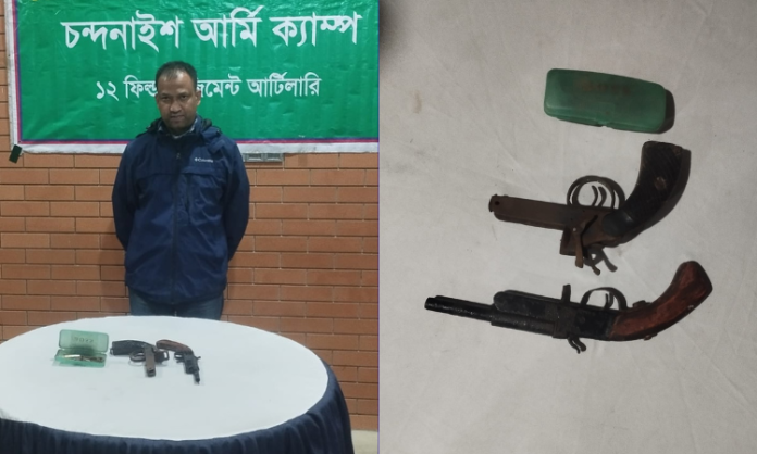এসময় তার কাছ থেকে ১টি দেশীয় অস্ত্র (এলজি) এবং ১টি ওয়ান শ্যুটিং পিস্তল উদ্ধার করা হয়।
