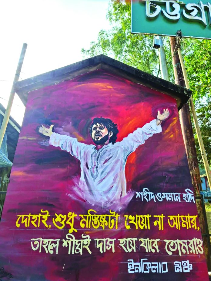 শহীদ শরীফ ওসমান হাদির সংগ্রাম ও আদর্শকে দেশব্যাপী ছড়িয়ে দেওয়া এবং তাঁর হত্যার বিচার দাবিতে চট্টগ্রাম বিশ্ববিদ্যালয়ে (চবি) দেওয়াল লিখন ও গ্রাফিতি অঙ্কন কর্মসূচি পালন করেছে চবি ইনকিলাব মঞ্চ।