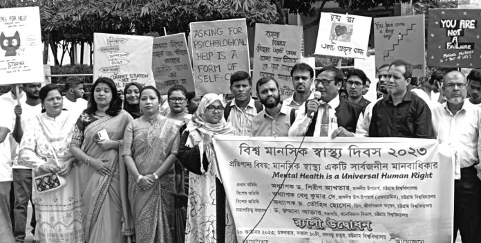 চবি মনোবিজ্ঞান বিভাগের উদ্যোগে ও দারুল ইরফান ইনস্টিটিউটের সহযোগিতায় বিশ্ব মানসিক স্বাস্থ্য দিবস উদযাপিত হয়েছে। ‘মানসিক স্বাস্থ্য একটি সর্বজনীন মানবাধিকার’ এ প্রতিপাদ্যে গত মঙ্গলবার প্রশাসনিক ভবনের সামনে বঙ্গবন্ধু চত্বরে সংক্ষিপ্ত আলোচনা অনুষ্ঠিত হয়। দিনব্যাপী নানা কর্মসূচির উদ্বোধন করেন উপ–উপাচার্য প্রফেসর বেনু কুমার দে।