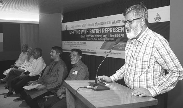 চট্টগ্রাম বিশ্ববিদ্যালয় দর্শন বিভাগের সুবর্ণজয়ন্তী উৎসব মহাসমারোহে উদযাপনের লক্ষ্যে আগামী ২৮ অক্টোবর দিনব্যাপী অনুষ্ঠানমালা আয়োজনের পরিকল্পনা নেওয়া হয়েছে। এ উপলক্ষে গত শুক্রবার চট্টগ্রাম প্রেস ক্লাবের পঞ্চম তলায় বিভাগের বিভিন্ন ব্যাচের প্রতিনিধিদের সভা অনুষ্ঠিত হয়। দর্শন বিভাগের চেয়ারম্যান ও সুবর্ণজয়ন্তী উদযাপন কমিটির আহ্বায়ক প্রফেসর ড. মো. আব্দুল মান্নানের সভাপতিত্বে সভায় বক্তব্য রাখেন রেজিস্ট্রেশন উপকমিটির আহ্বায়ক প্রফেসর ড. মো. ইকবাল শাহীন খান, চবি দর্শন অ্যালমনাই অ্যাসোসিয়েশনের আহ্বায়ক প্রফেসর মনসুর উদ্দিন আহমদ, অ্যালমনাই অ্যাসোসিয়েশনের সদস্য সচিব মাকসুদুর রহমান মাসুদ, সাবেক শিক্ষার্থী সেলিম উদ্দিন, এস এম মইনউদ্দিন আহমেদ চৌধুরী, এ এস এম নাজমুল হাছান, চৌধুরী রিয়াদ, ঐশ্বরিয়া দেবনাথ, ইমতিয়াজ আহমেদ, ইসমাইল হোসেন, বাবুল, জাকির হোসেন, সৈকত বড়ুয়া, তাহমিনা আফরোজ, মাহবুবুর রহমান, ইরফানুল সাজ্জাদ ও নাদিম হোসাইন। অনুষ্ঠান পরিচালনা করেন উদযাপন কমিটির সদস্য সচিব ও বিভাগের সহযোগী অধ্যাপক মাছুম আহমেদ। বিভাগীয় শিক্ষকদের মধ্যে আরো উপস্থিত ছিলেন সহযোগী অধ্যাপক ড. শিরিন আকতার, সহকারী অধ্যাপক মিজানুর রহমান, জওশন আরা জলি ও মোহাম্মদ নাজেমুল আলম।