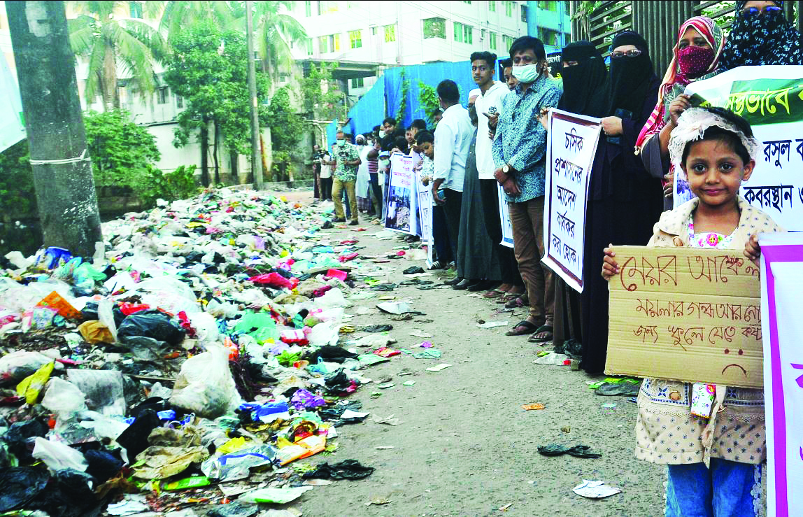 নগরীর জনবহুল এলাকা পশ্চিম বাকলিয়ার খালপাড়, বায়তুল মামুর জামে মসজিদ, কবরস্থান ও বাসাবাড়ির সামনের চলাচলের রাস্তায় চসিকের নিষেধাজ্ঞা অমান্য করে ডাস্টবিন স্থাপন করে ময়লার ভাগাড়ে পরিণত করার প্রতিবাদে গতকাল বিকেলে স্থানীয় বাসিন্দারা মানববন্ধন করেছেন। গ্রীন সিটি হাউজিং সোসাইটি ও স্থানীয় এলাকাবাসী ও মুসল্লিদের আয়োজনে অনুষ্ঠিত মানববন্ধনে একর্ড গ্রীন ভিলেজ ফ্ল্যাট ওনার্স এসোসিয়েশনের সভাপতি মোহাম্মদ এরশাদ উল্লাহ, প্রফেসর নূরুল্লাহ, মোহাম্মদ আলম খান, ইসমাইল জসীম, নাজিমুদ্দিন, ইসমাইল ইমন, সাইফুল ইসলাম, আজিজুল হক, ছমদুল করিম ভুট্টো, সালমান ফারসি, সালাউদ্দিন চৌধুরী, চৈতি বড়ুয়া প্রমুখ বক্তব্য রাখেন। মানববন্ধনে উপস্থিত স্থানীয় বাসিন্দা, নারী ও শিশু শিক্ষার্থীরা বলেন, আমরা এই বর্জ্যের স্তূপের কারণে স্কুলে যাওয়াআসার সময় ময়লার দুর্গন্ধে অসুস্থ হয়ে পড়ছি, সেই সাথে কুকুরের উৎপাতে আতংকে আছি। তারা বলেন, আমরা সুস্থভাবে বাঁচতে চাই, আমাদের স্বাভাবিকভাবে বাঁচতে দিন। মাননীয় মেয়র ঘোষিত ক্লিন, গ্রীন, হেলদি ও সেইফটি সিটির বাস্তবায়ন চাই। আমাদের যেমন স্কুলে যাওয়া আসার সময় সমস্যায় পড়তে হচ্ছে তেমনি বৃদ্ধ, অসুস্থ রোগীদের হাসপাতালে চিকিৎসা নিতে গিয়ে ভোগান্তিতে পড়তে হচ্ছে। মুসল্লিদের মসজিদে নামাজ আদায় করতে যেতে অসুবিধা হচ্ছে।